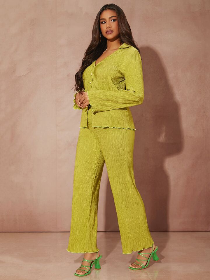 طقم توب بأزرار أمامية واطراف مموجة وبنطلون بساق واسع