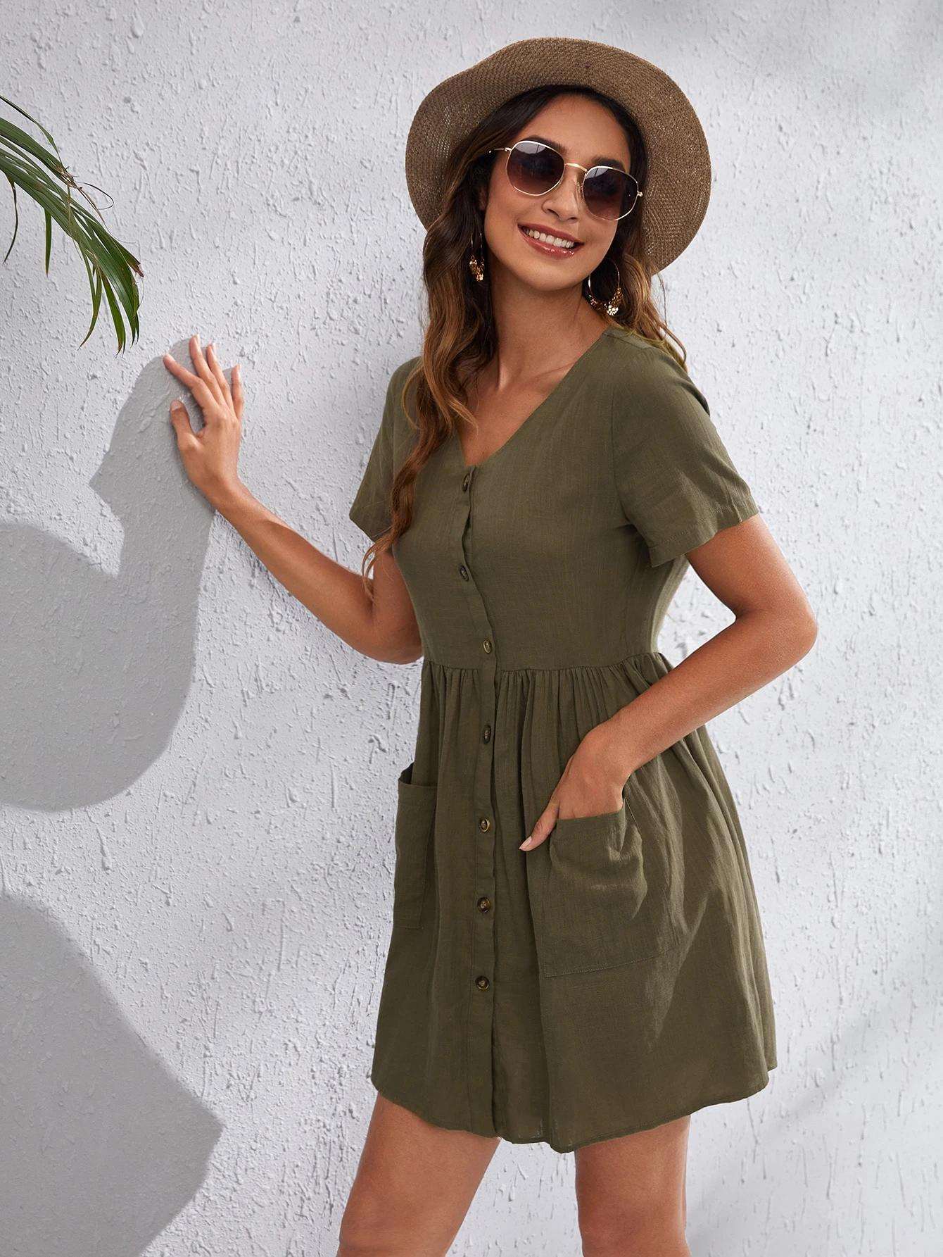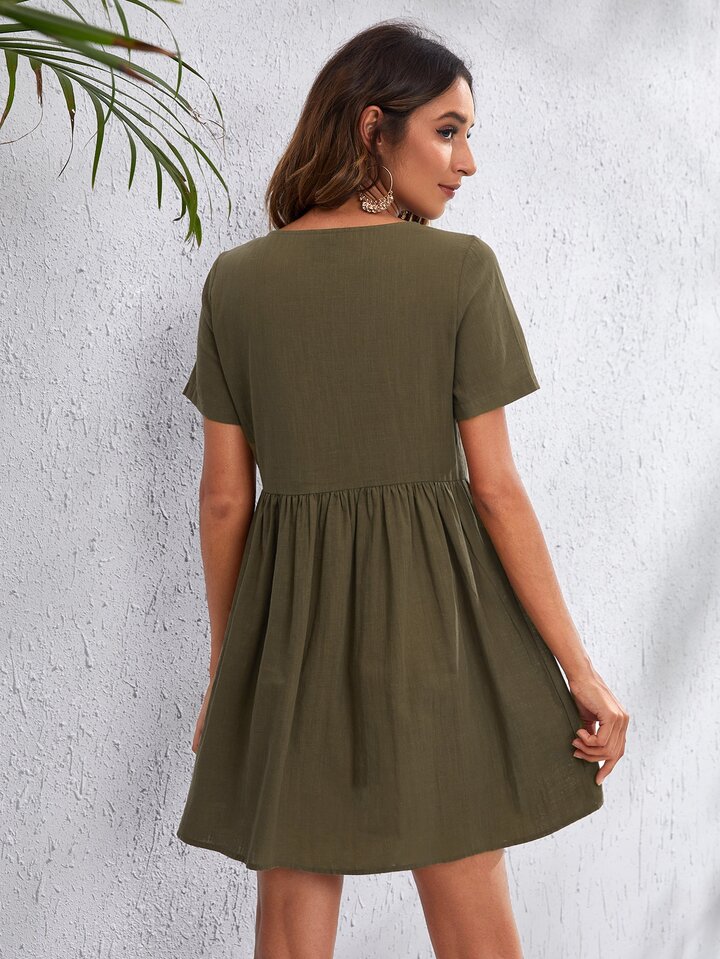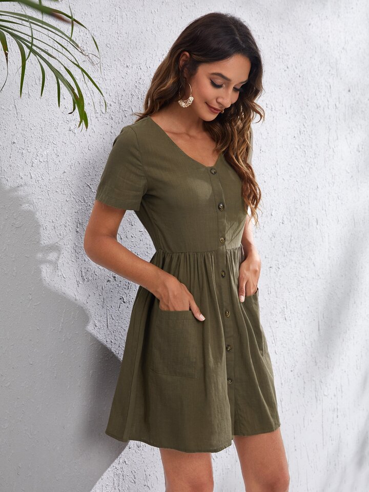 فستان بجيب مرقع وبزرار امامي
