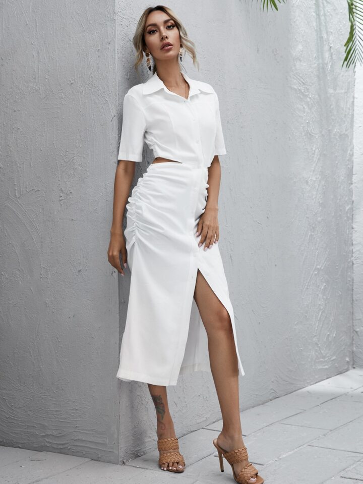 فستان قميص مقصوص بتفاصيل مدروز وبأزرار امامي