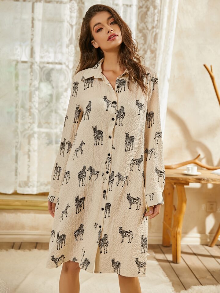 قمصان نوم وفستاتين ليلية بازرارأمامية تصميم الحيوانات كاجوال