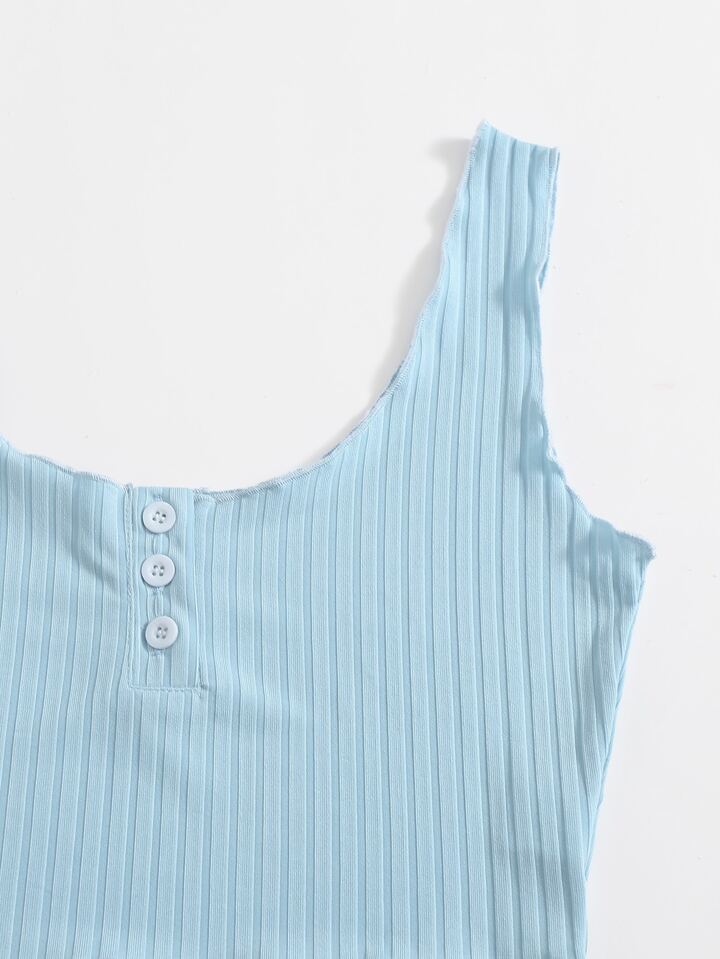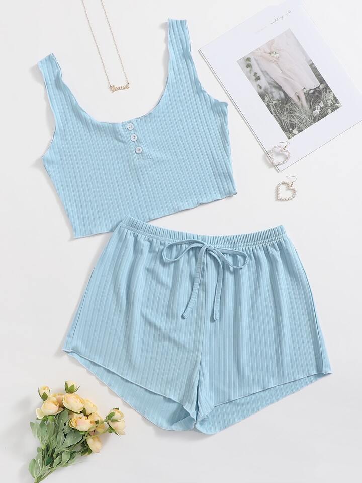 طقم سروال قصير بعقدة مع لباس علوي تانك مضلع بازرار