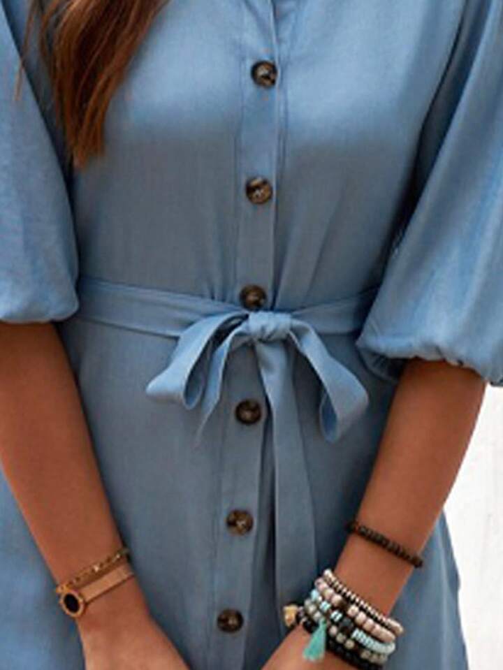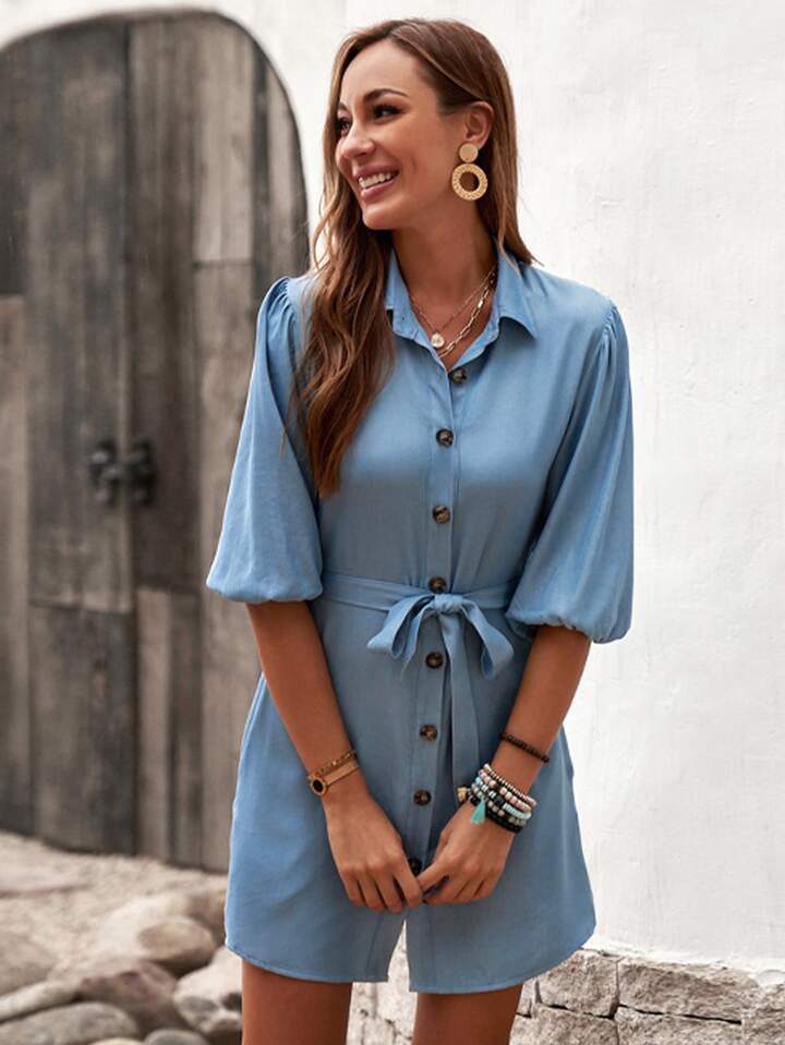 فستان بحزام أزرار من أعلى إلى أسفل أكمام فانوس