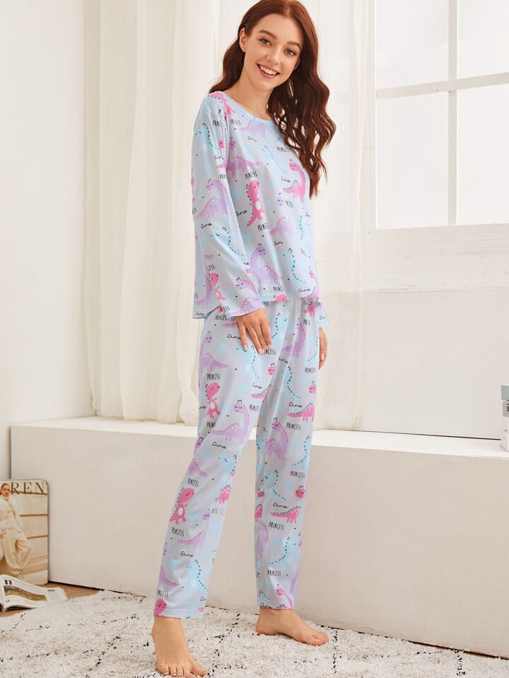 طقم بيجامة/ طقم نوم مع طباعة الديناصور الكرتوني وغطاء للعين