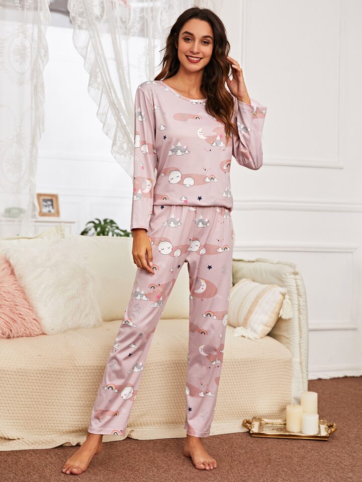 طقم بيجامة مع غطاء للعين بطبعات كرتونية، ملابس خريفية