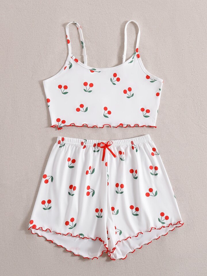 طقم بيجامة/مجموعة بيجاما طباعة الكرز مع أربطة أمامية وتشطيب ورقي أبيض