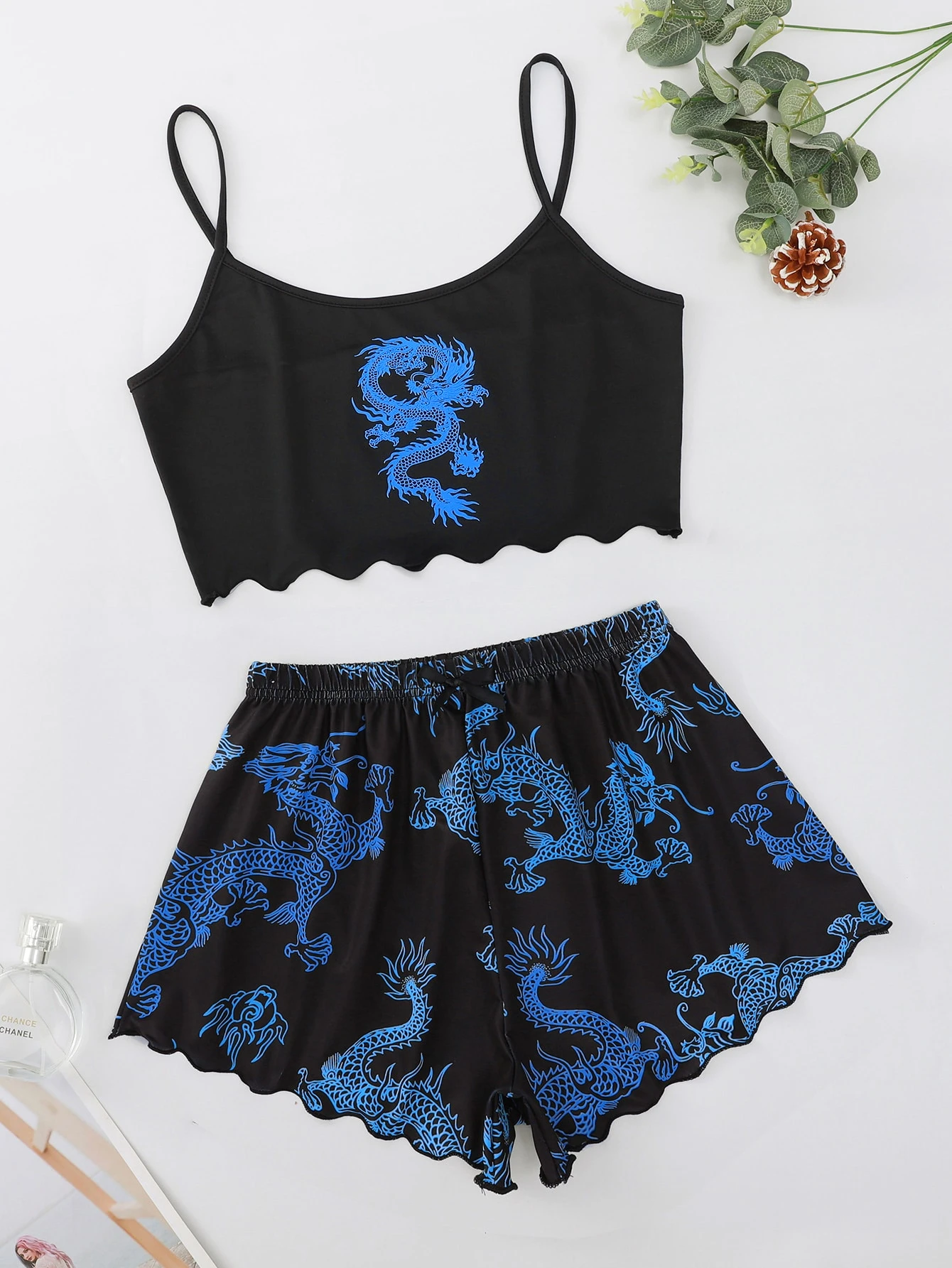 طقم بيجامة كامي مقلم خس وبطباعة تنين صيني