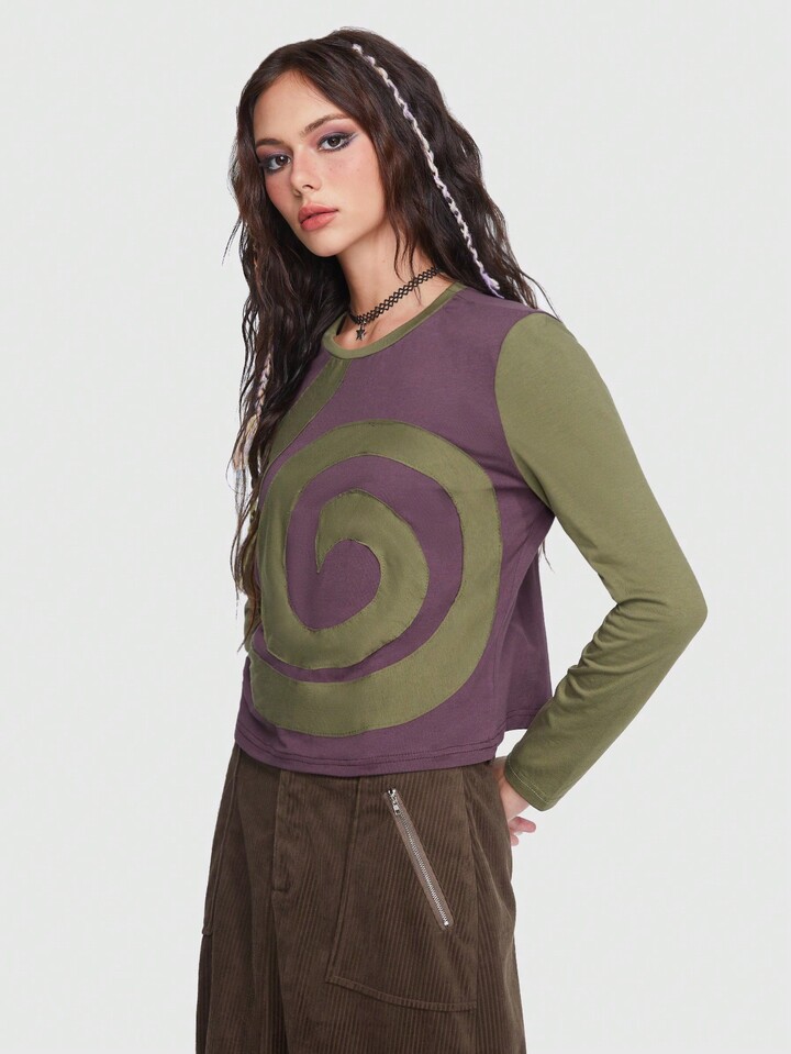 تيشيرت بياقة دائرية وأكمام طويلة بتصميم كتل الألوان