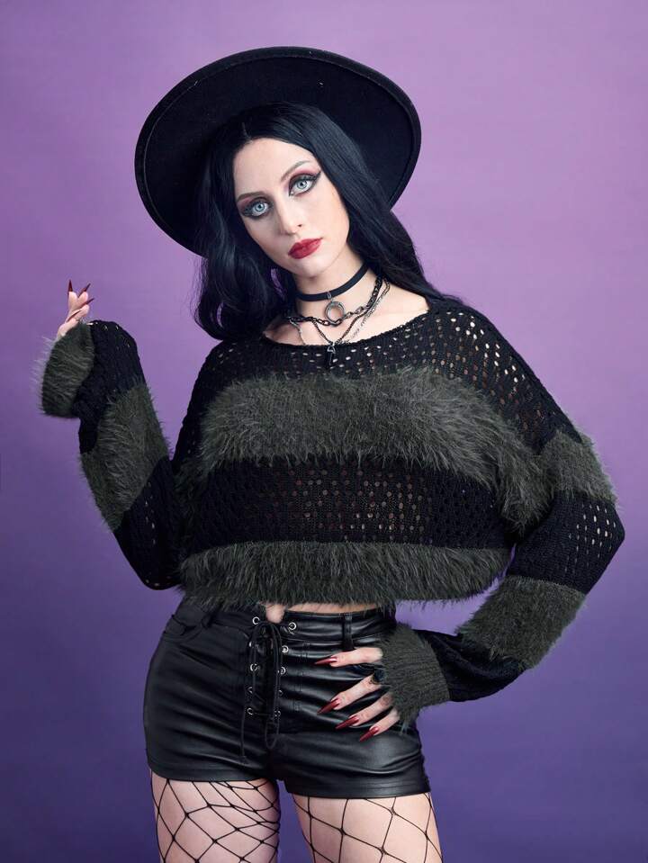 كنزة صوف ألوان متباينة منخفض الاكتاف منسوج بفتحات صغيرة