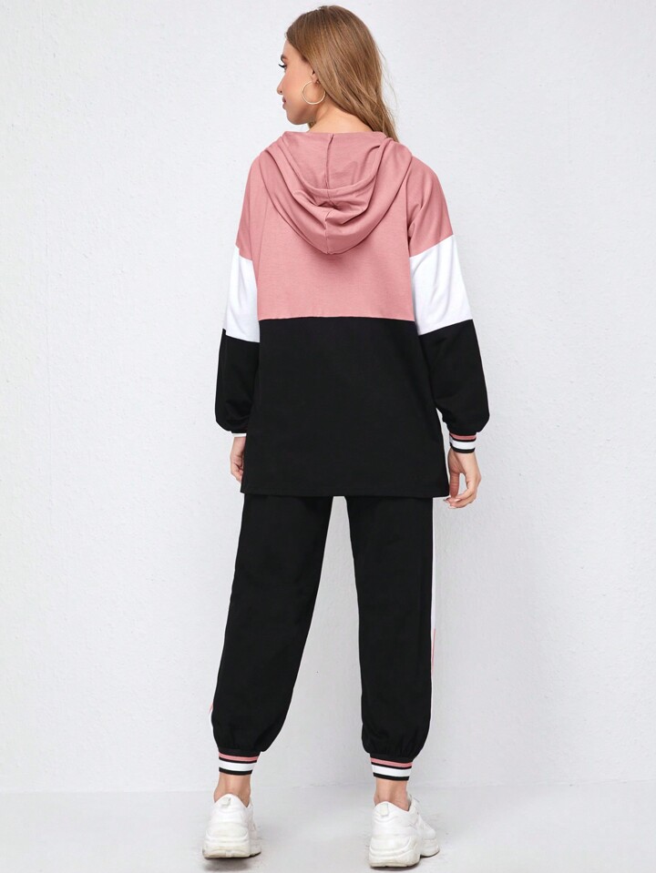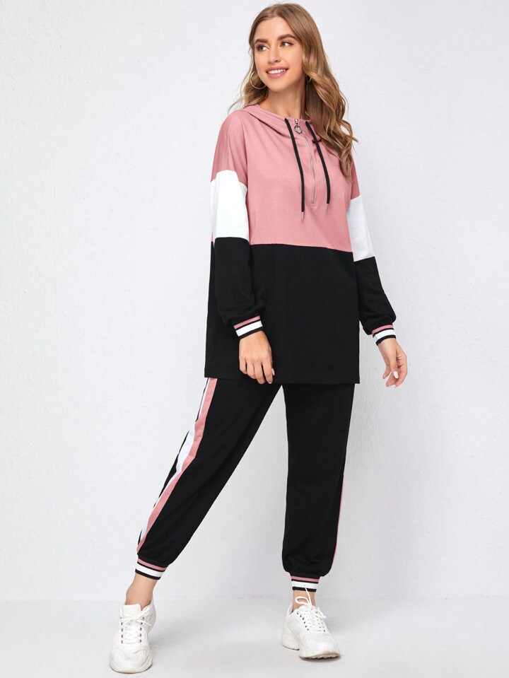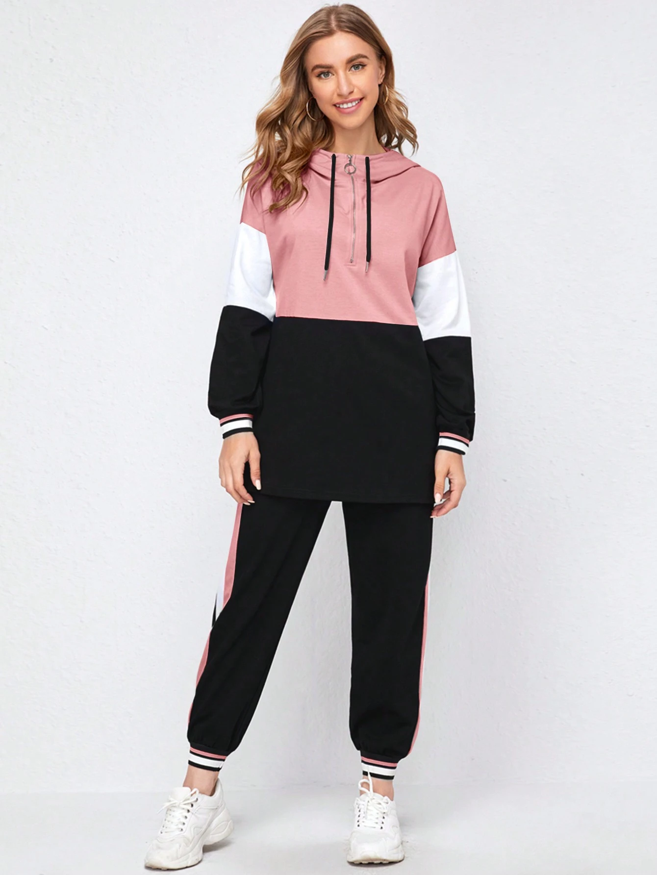 طقم جوقينز مع هودي باربطة وبنصف فتحة عنق بسستة بألوان متجانسة