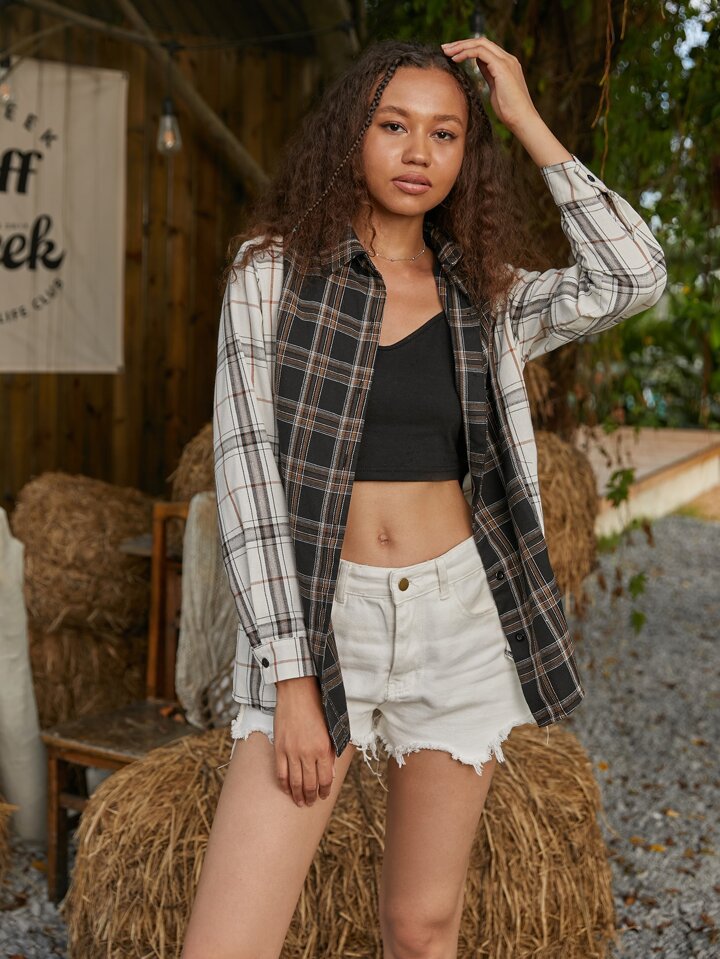 قميص ألوان متباينة مربعات ملونة أزرار أمامية