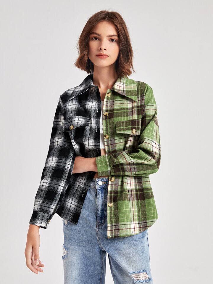 قميص ألوان متباينة مع طباعة مربع النقش أزرار أمامية