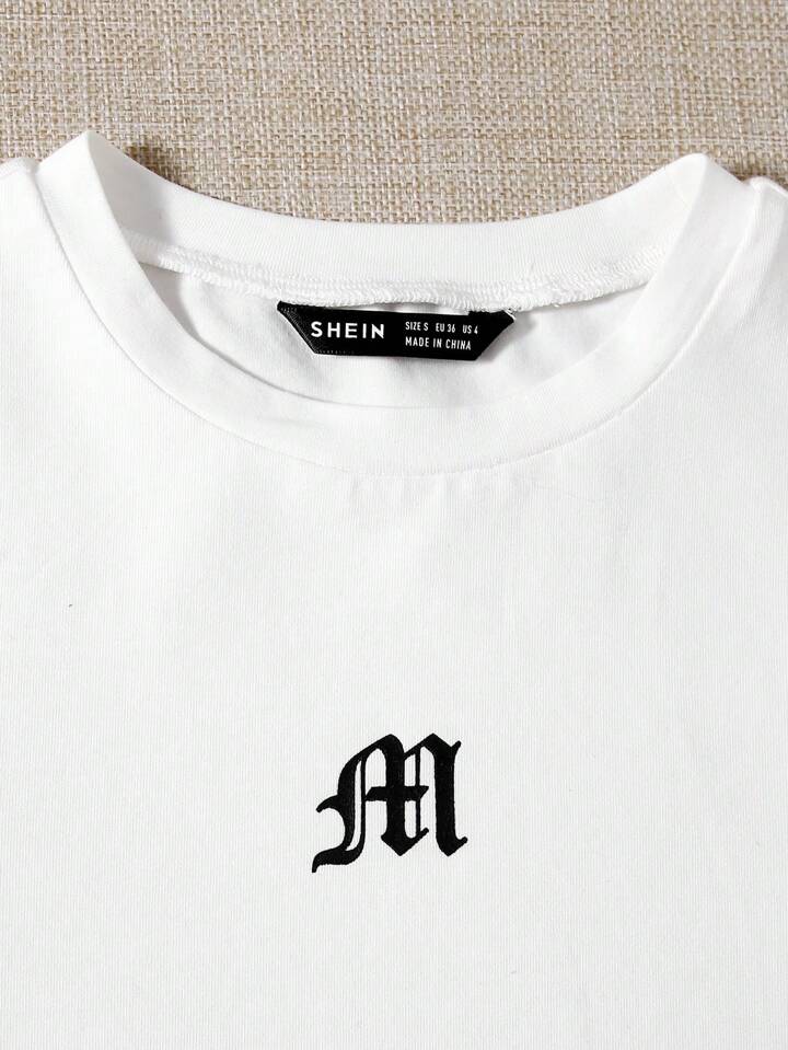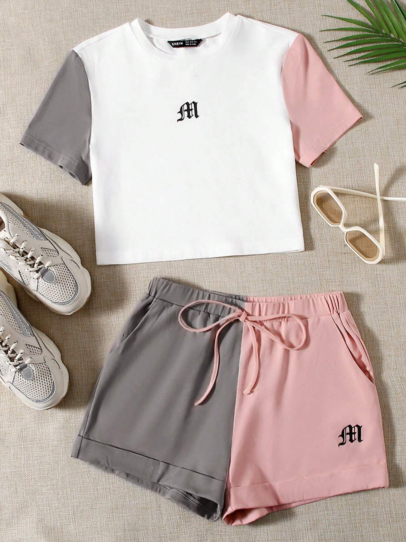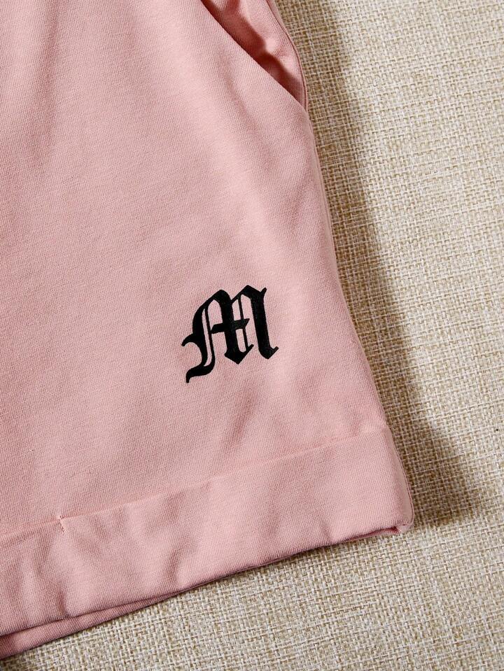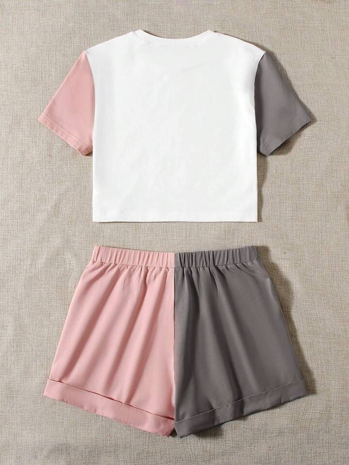 طقم سروال قصير بحافة ملفوف مع لباس علوي بطباعة جرافيك وباكمام بألوان متجانس
