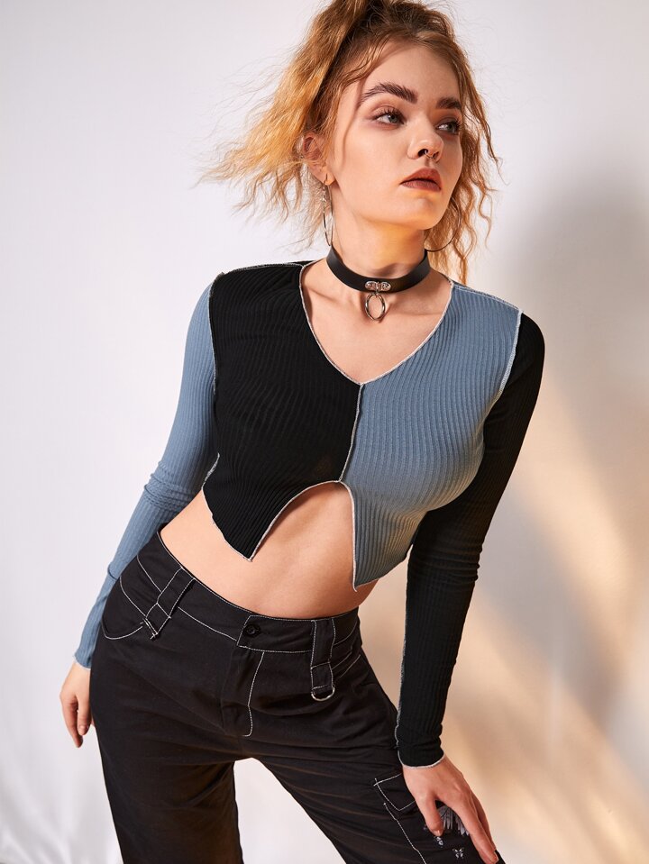 تي شيرت ألوان متباينة فتحة مضلع