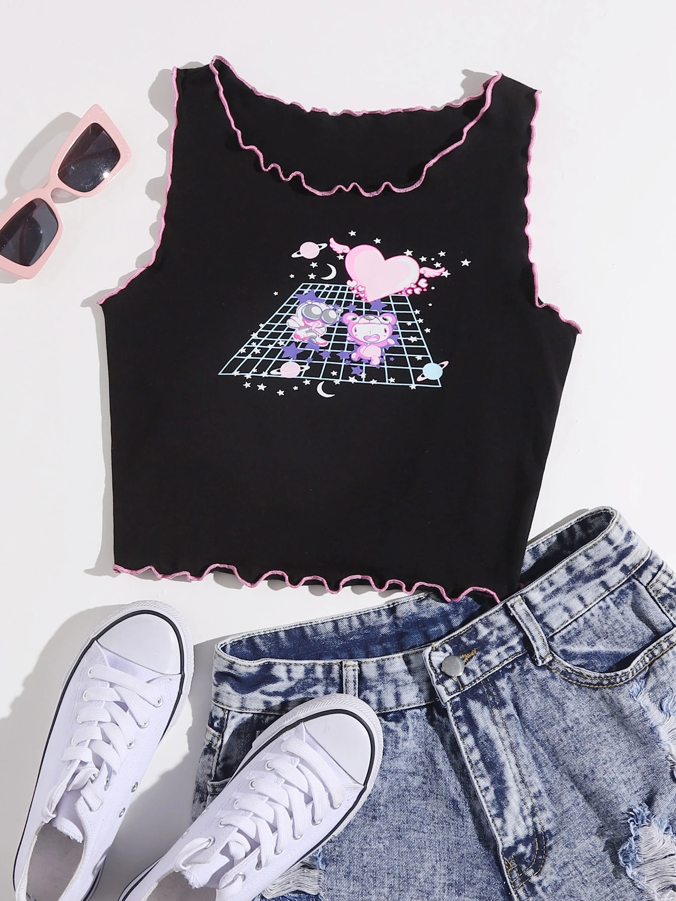 لباس علوي تانك بجرافيك رسوم كارتون مقلم خس وبشريط متباين