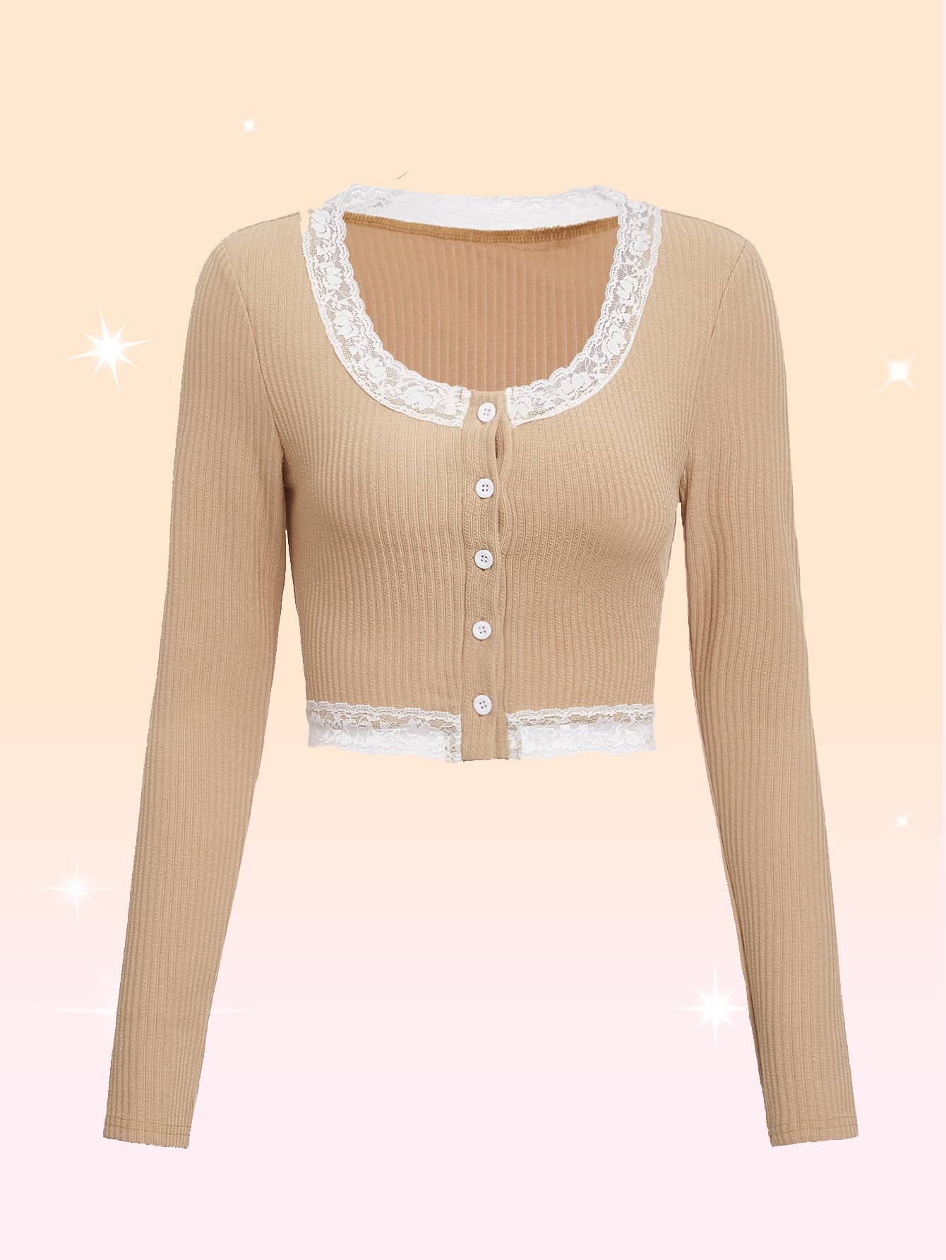 تي شيرت قصير دانتيل متباين اللون أزرار أمامية مضلع