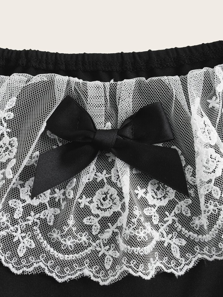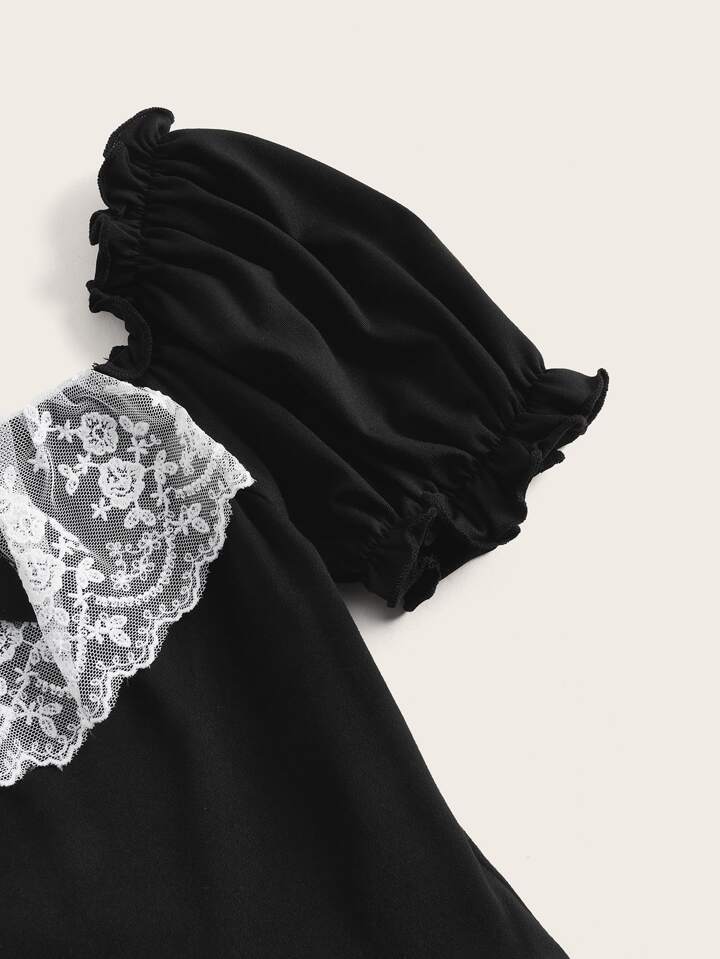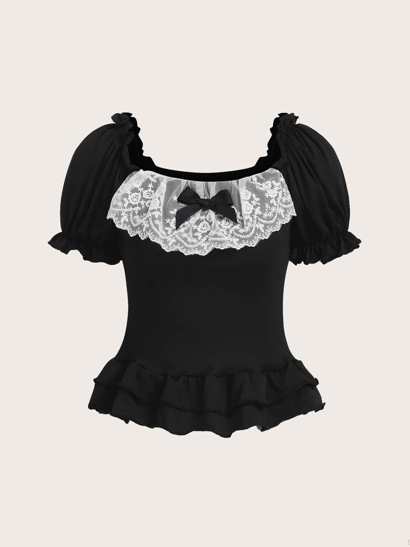 تي شيرت دانتيل متباين اللون اكمام منتفخة حافة مكشكشة