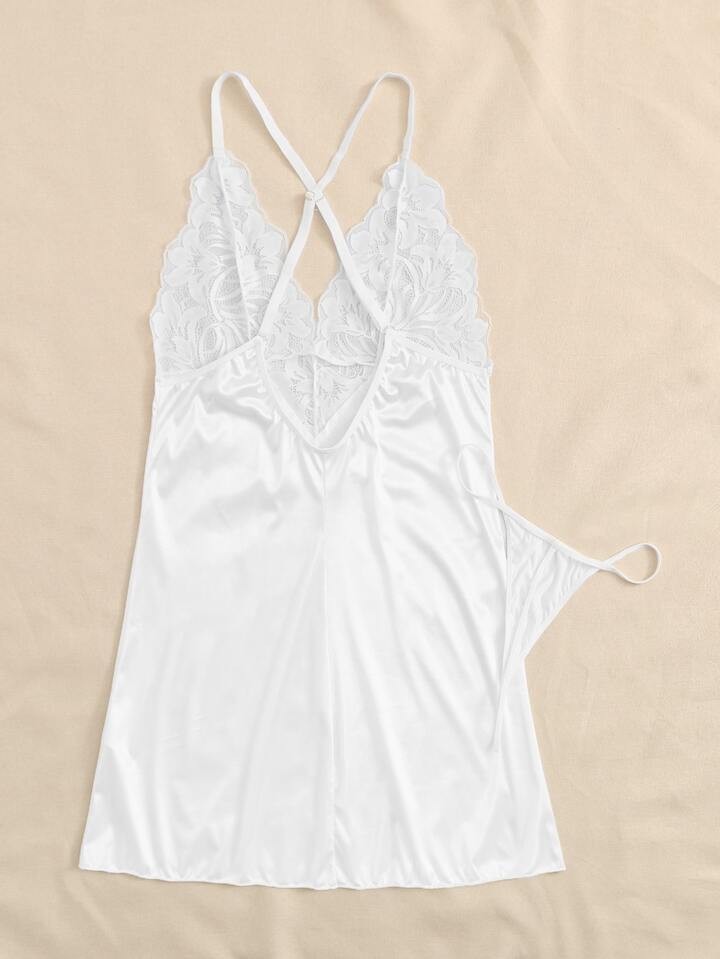 شلحة ساتان بدانتيل متباين مع سروال داخلي رفيع