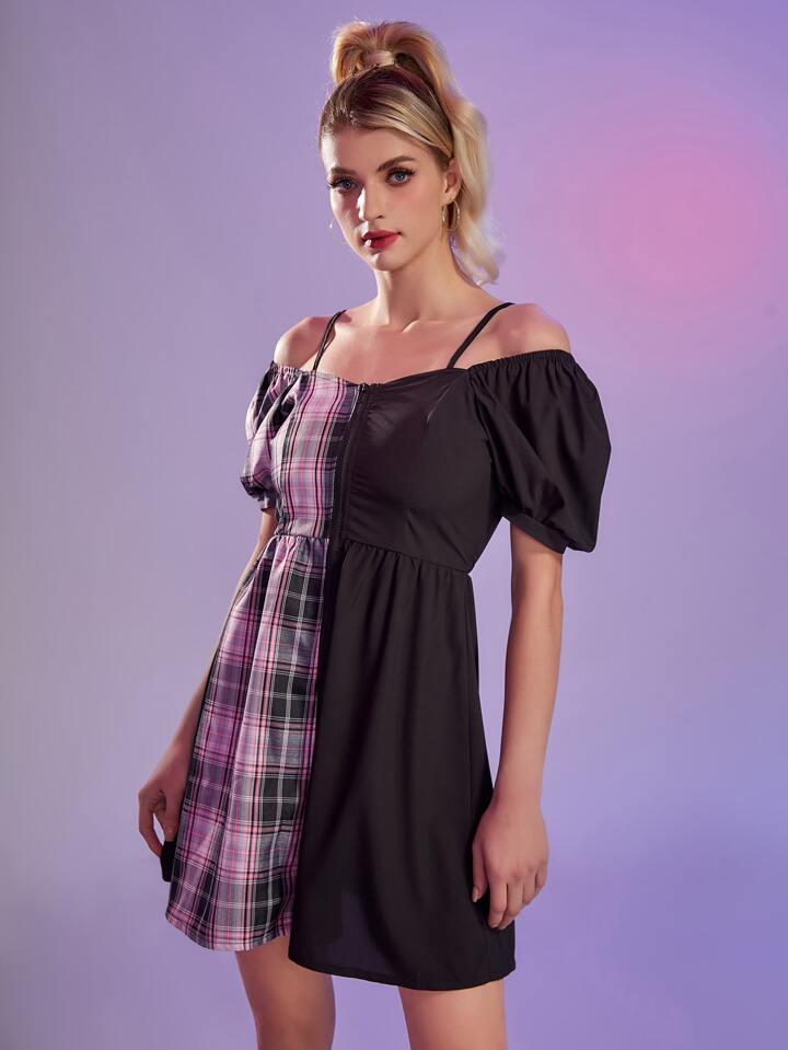 فستان مربع النقش متباين كتف مكشوف سستة