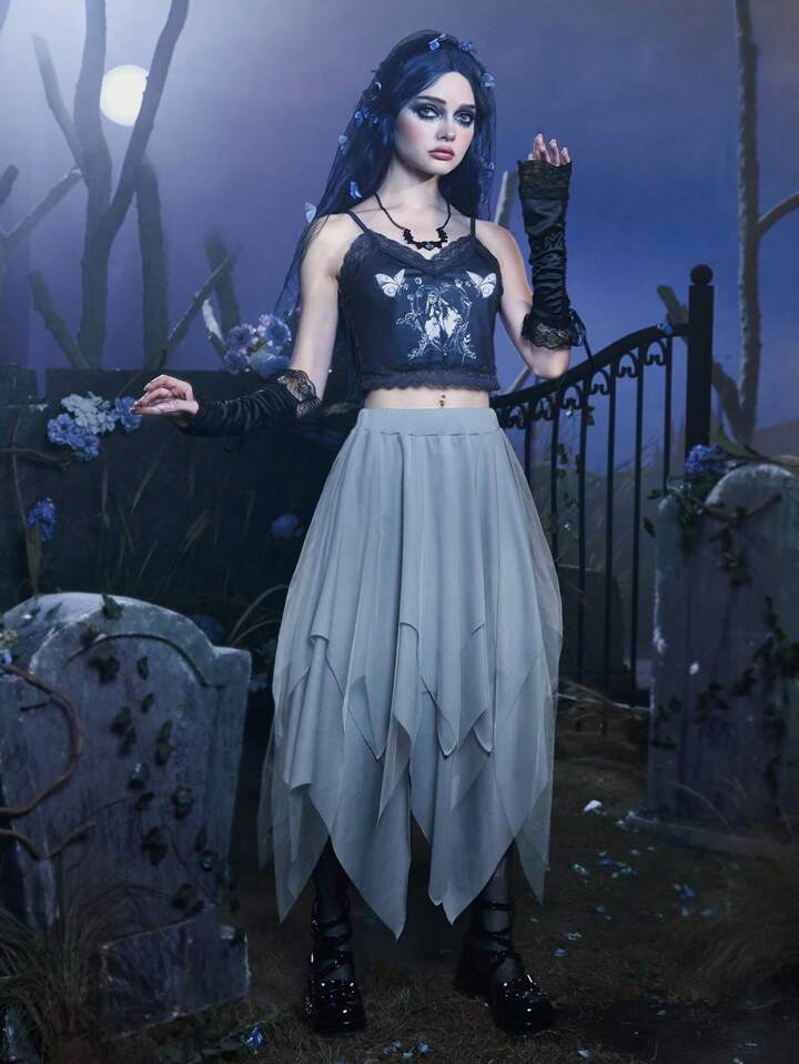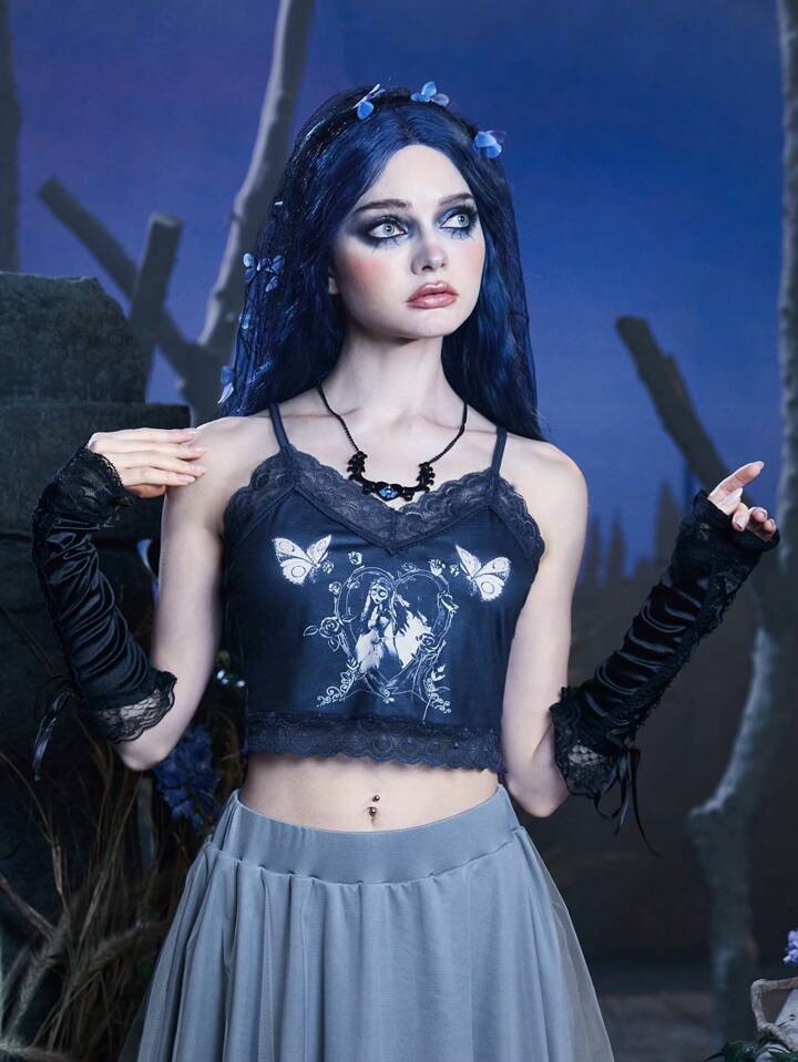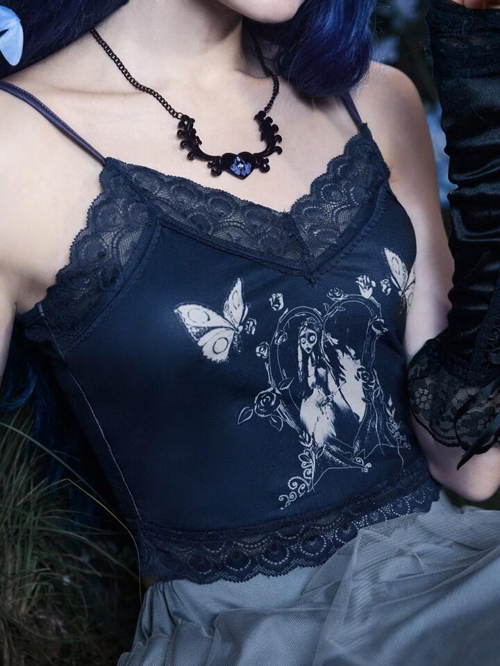 Corpse Bride | ROMWE صدرية كامي بطباعة الفراشة دانتيل متباين اللون