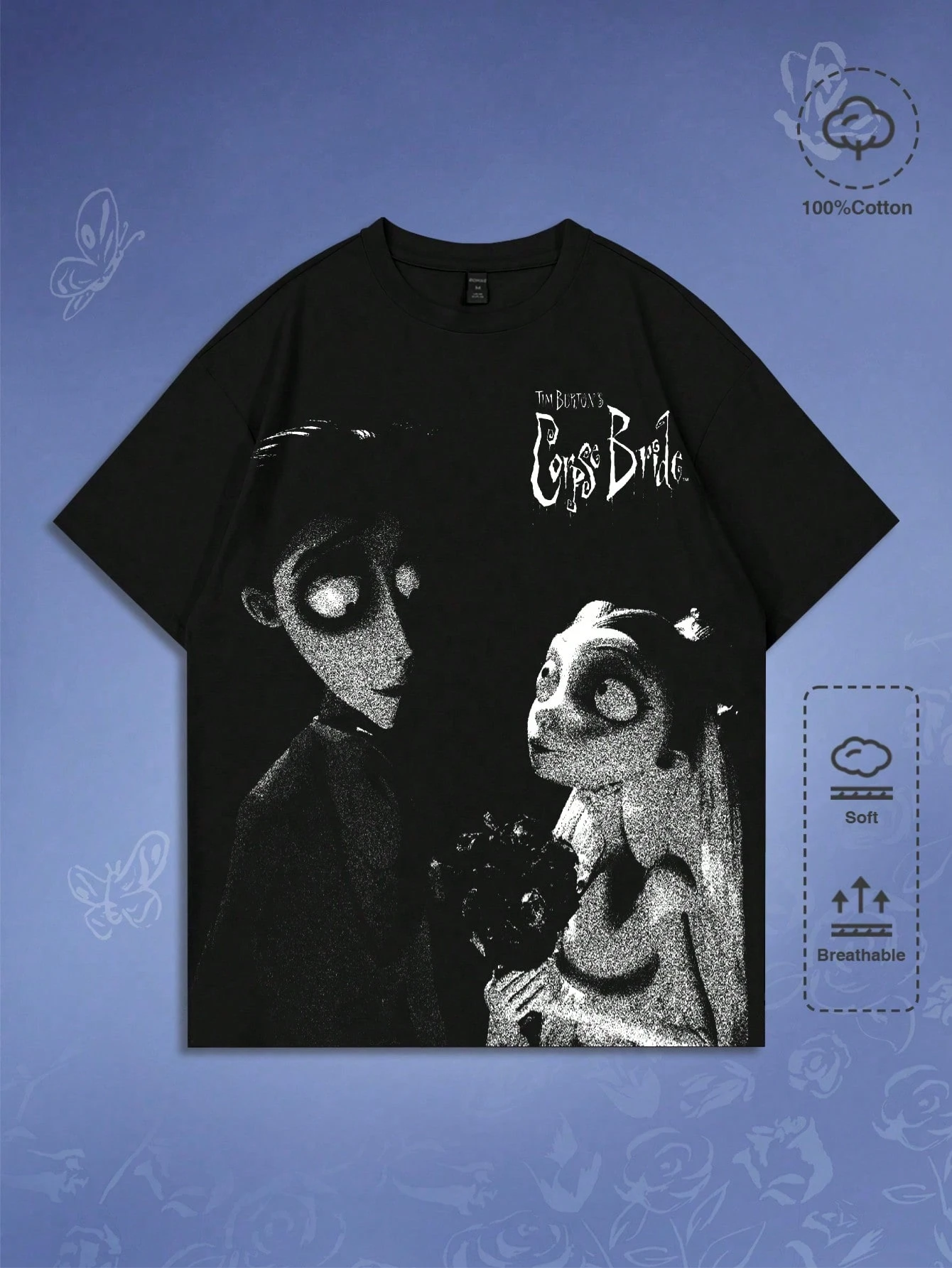 Corpse Bride | ROMWE قميص تي شيرت رجالي بطبعات كرتونية وحروف، فضفاض الكتف، قصير الأكمام، مناسب للصيف والمدرسة، بطراز عام 2000