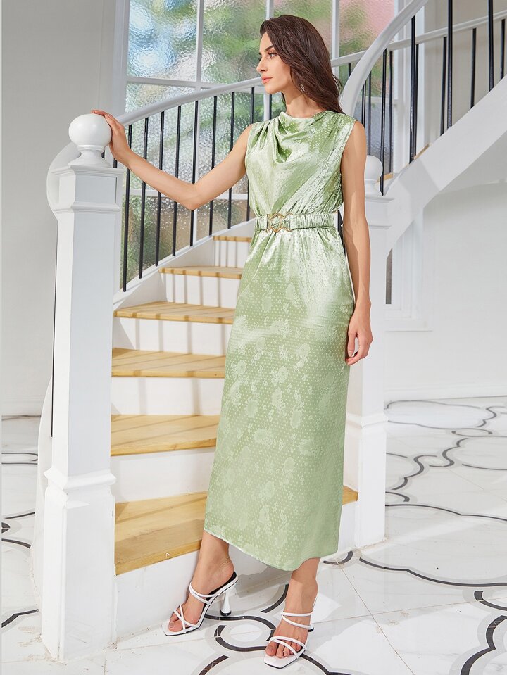 فساتين ياقة مطوية حزام بحافة شق طباعة أزهار جاكار ساتان
