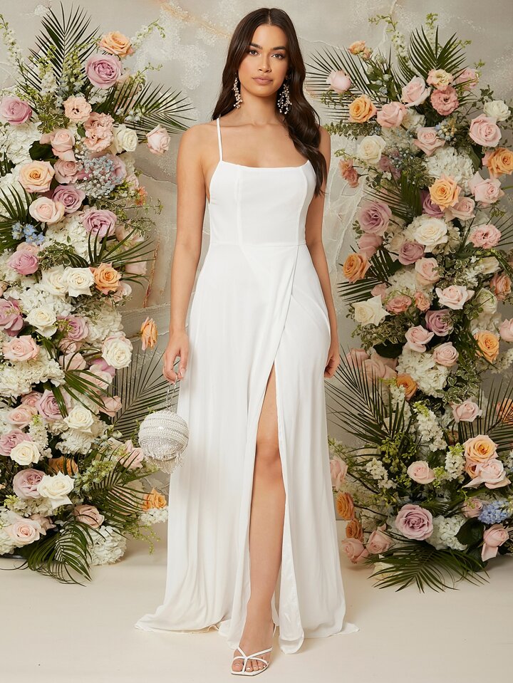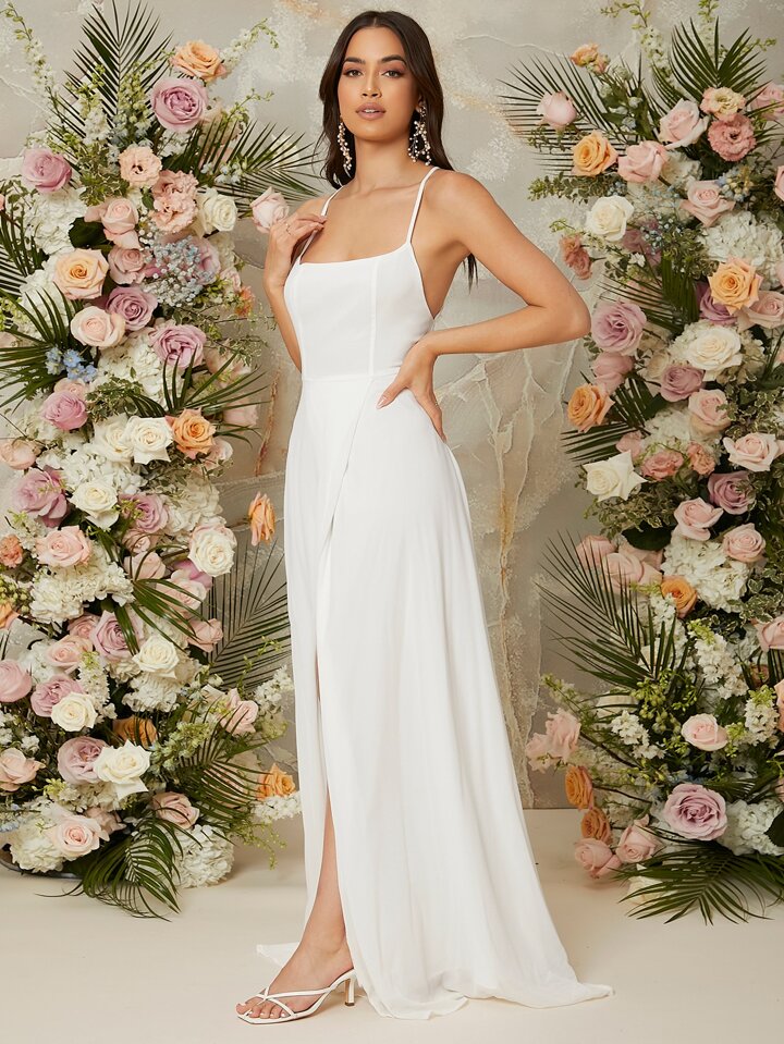 فستان زفاف أنيق باكتاف مشقوق وظهر مفتوح أبيض، فستان زفاف وفستان وصيفة الشرف