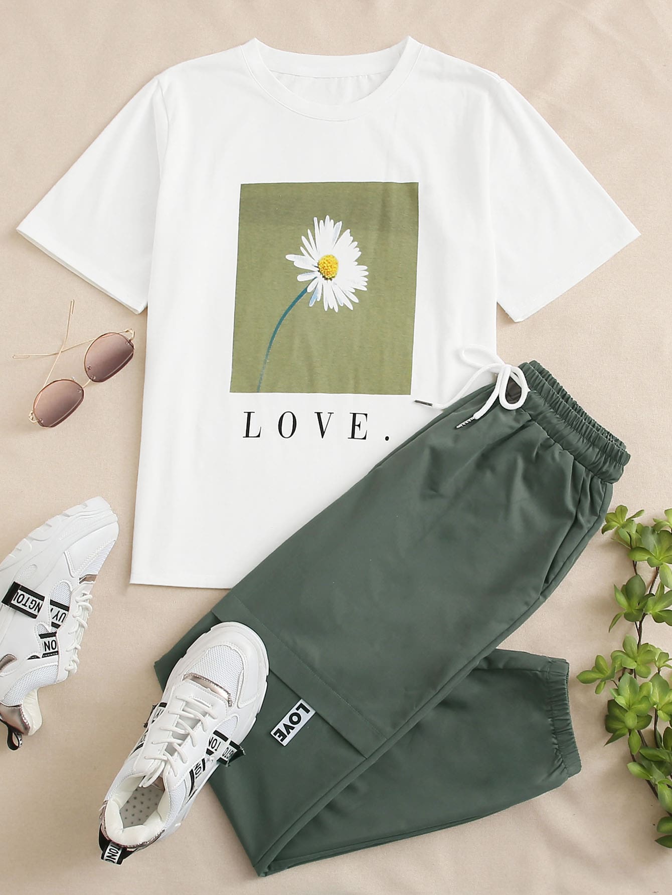 سروال رياضي بأربطة خصر مع تي شيرت بطباعة زهر وعبارة