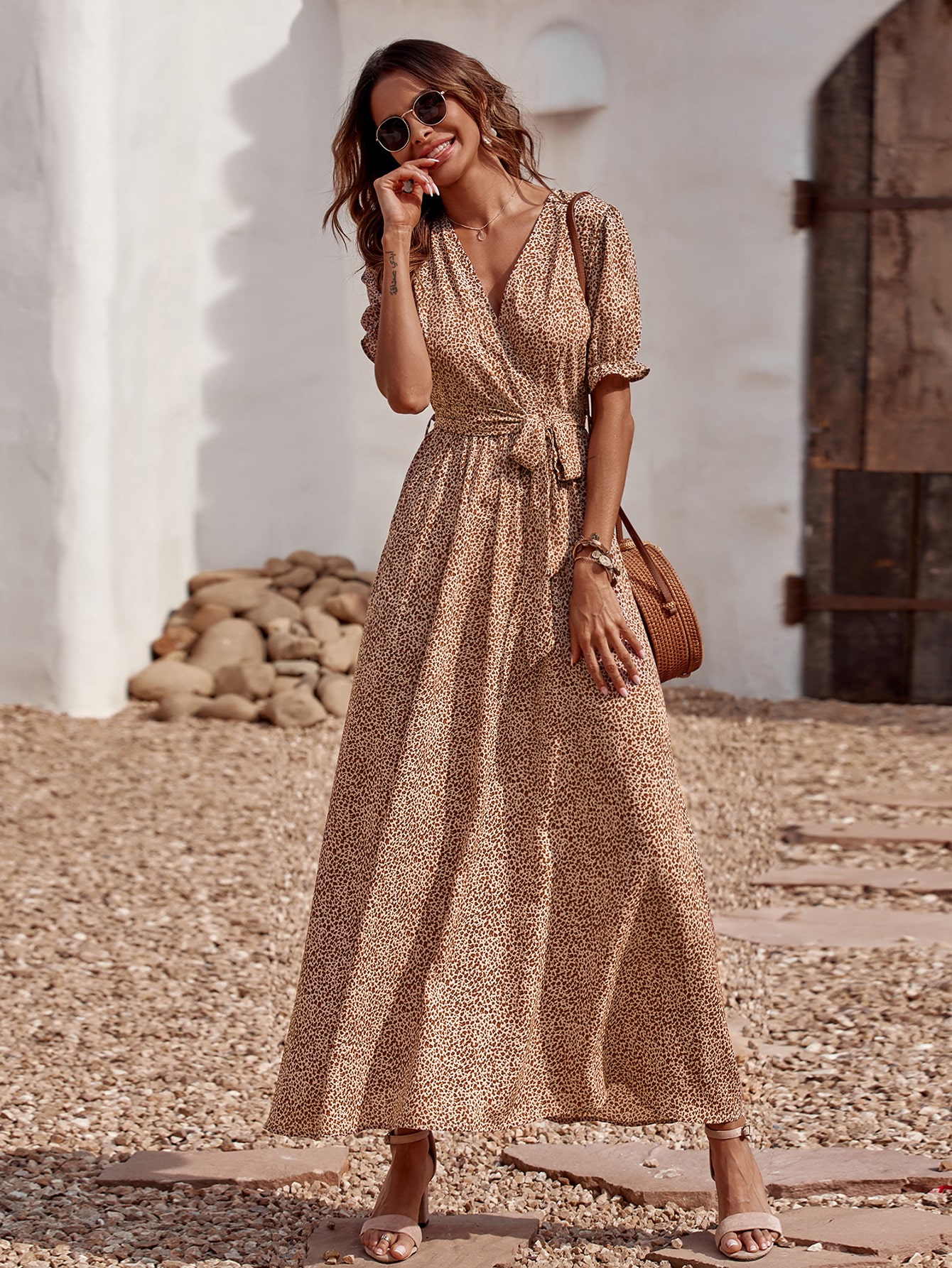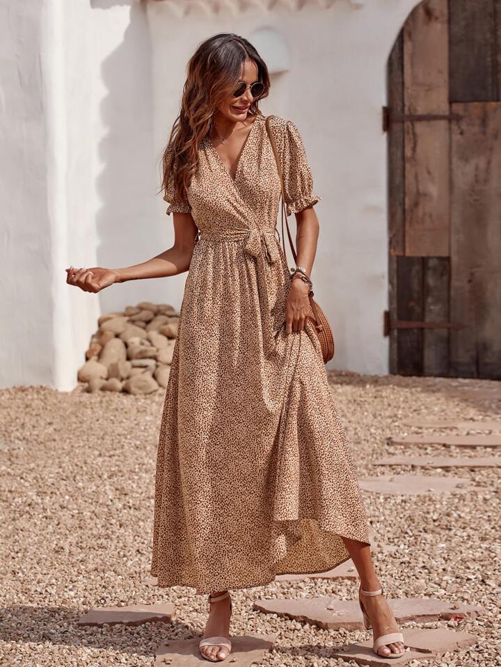 فستان بحزام بعنق متداخل وبطباعة مرقط