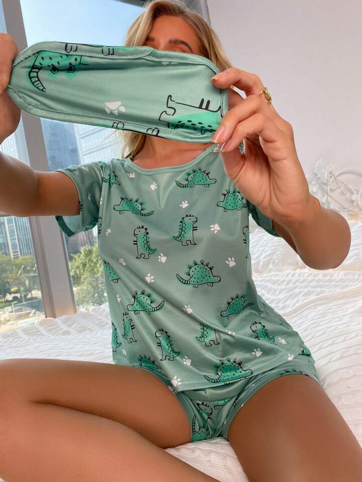 طقم بيجامة بطباعة ديناصور مع قناع عين