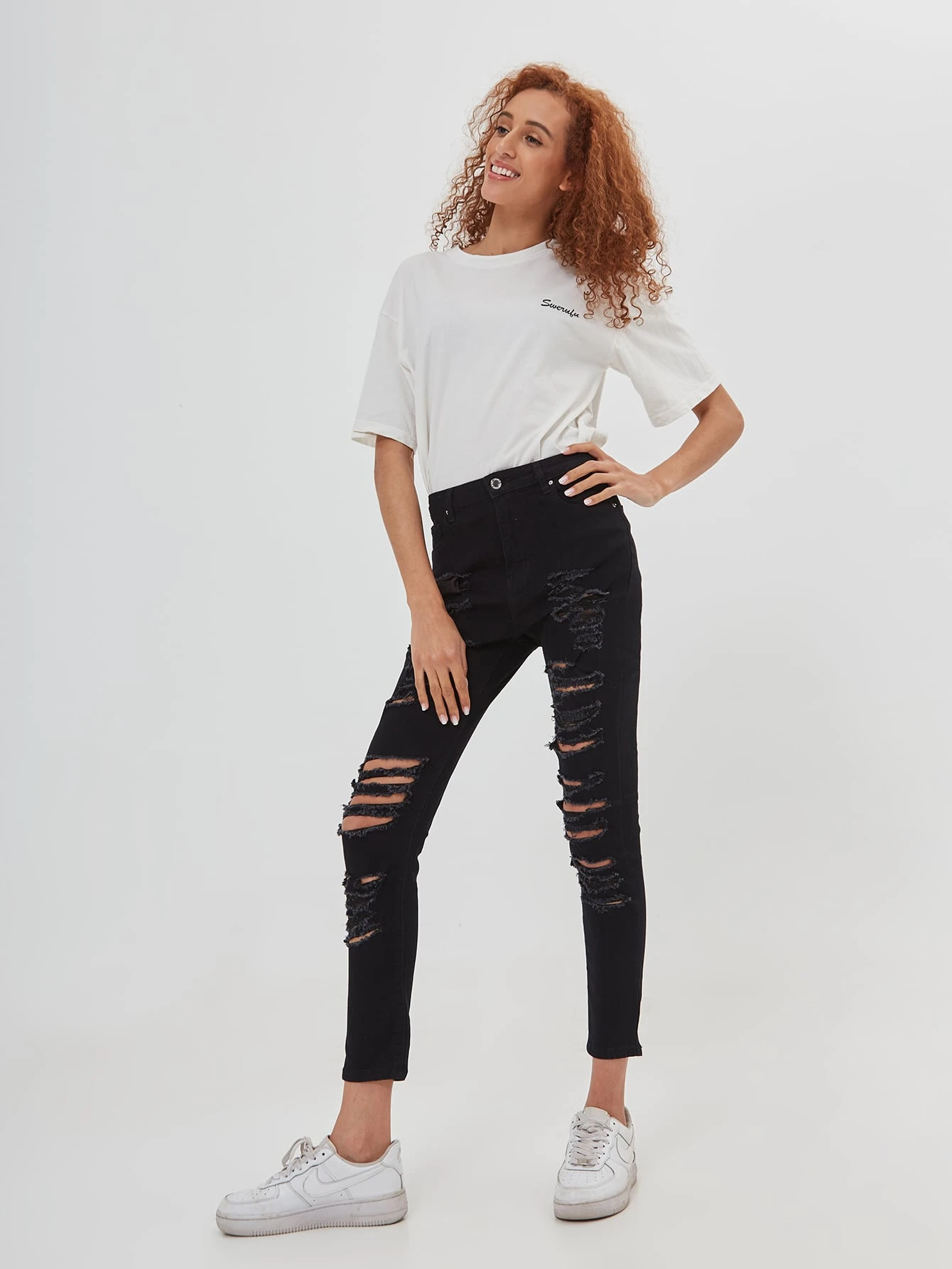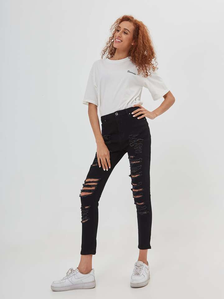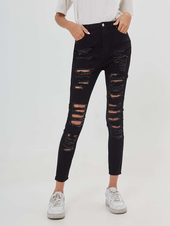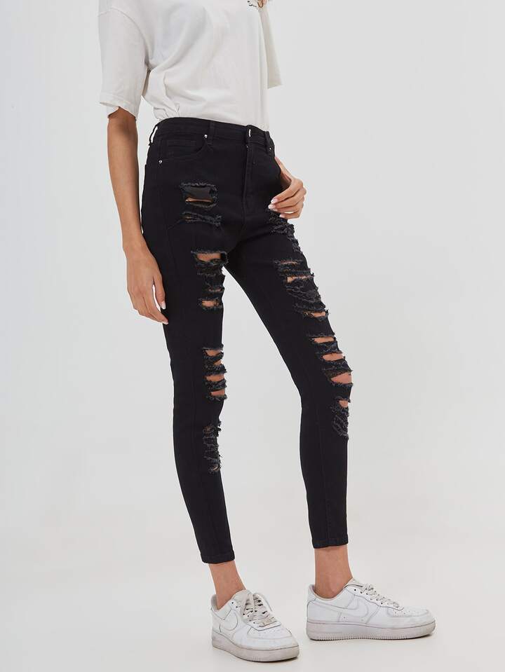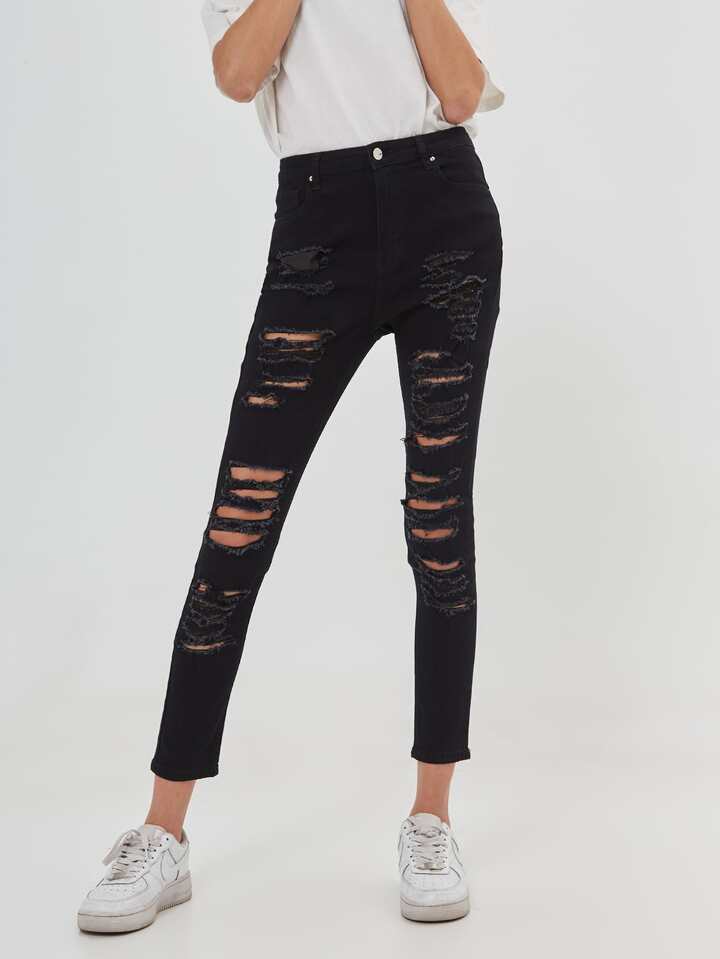سروال جينز نحيل بتفاصيل ممزق بدون حزام