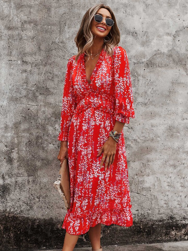 فستان ماكسي بياقة عميقة على شكل V وكشكشة في الذيل بطبعة زهور صغيرة، ملابس لرأس السنة الجديدة، ملابس للشاطئ والعطلات للنساء، ملابس خريفية للنساء