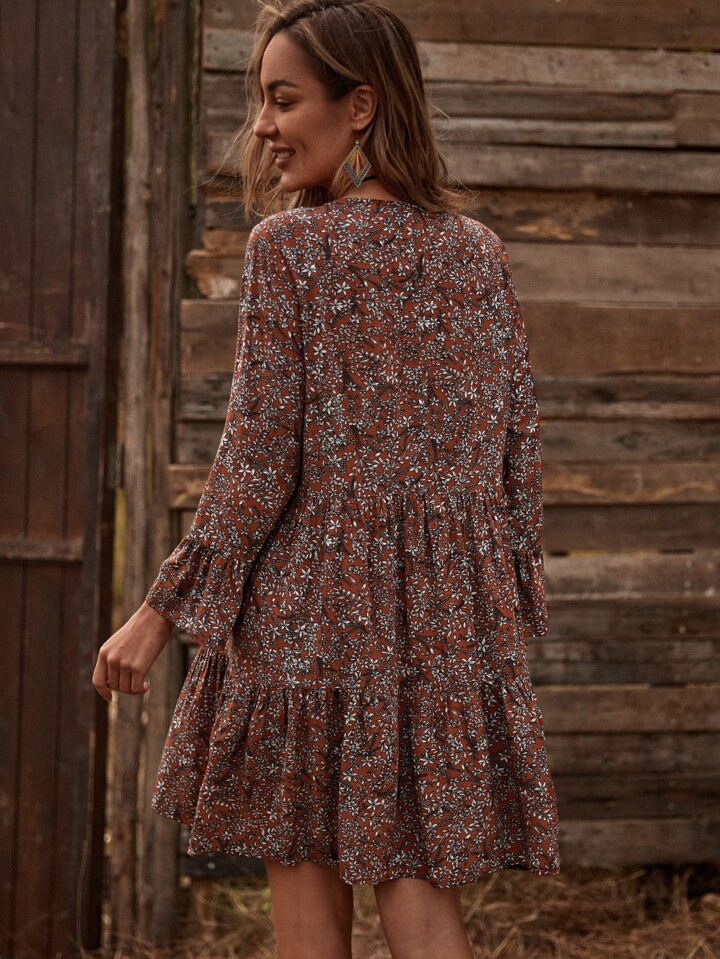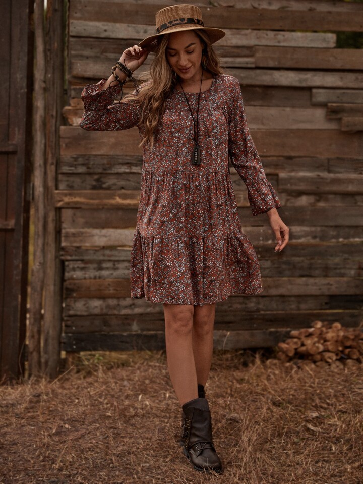 فستان قصير من القماش الحريري المرتفع الألوان بأكمام كبيرة فضفاضة منفرجة، ياقة دائرية، فضفاض، أكمام كبيرة متطايرة، طباعة زهور صغيرة، مناسب للارتداء اليومي الكاجوال في الربيع والخريف