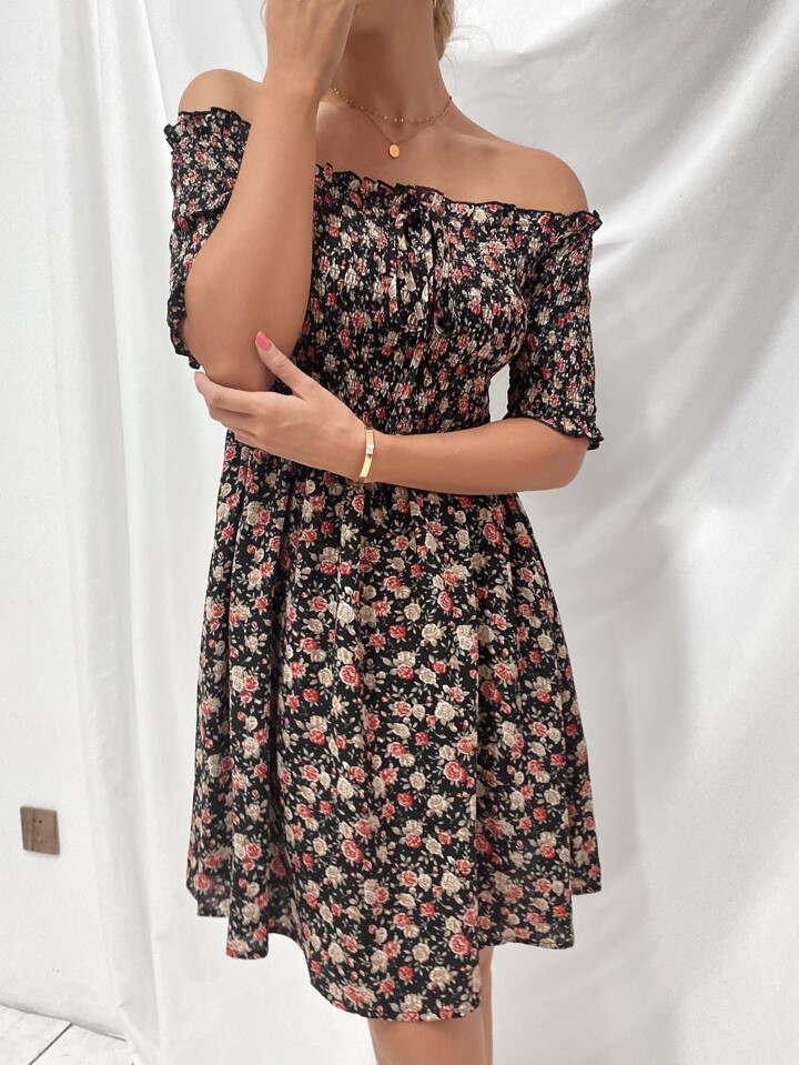 فستان باردوت مدرز مقلم مكشكش ومزهر