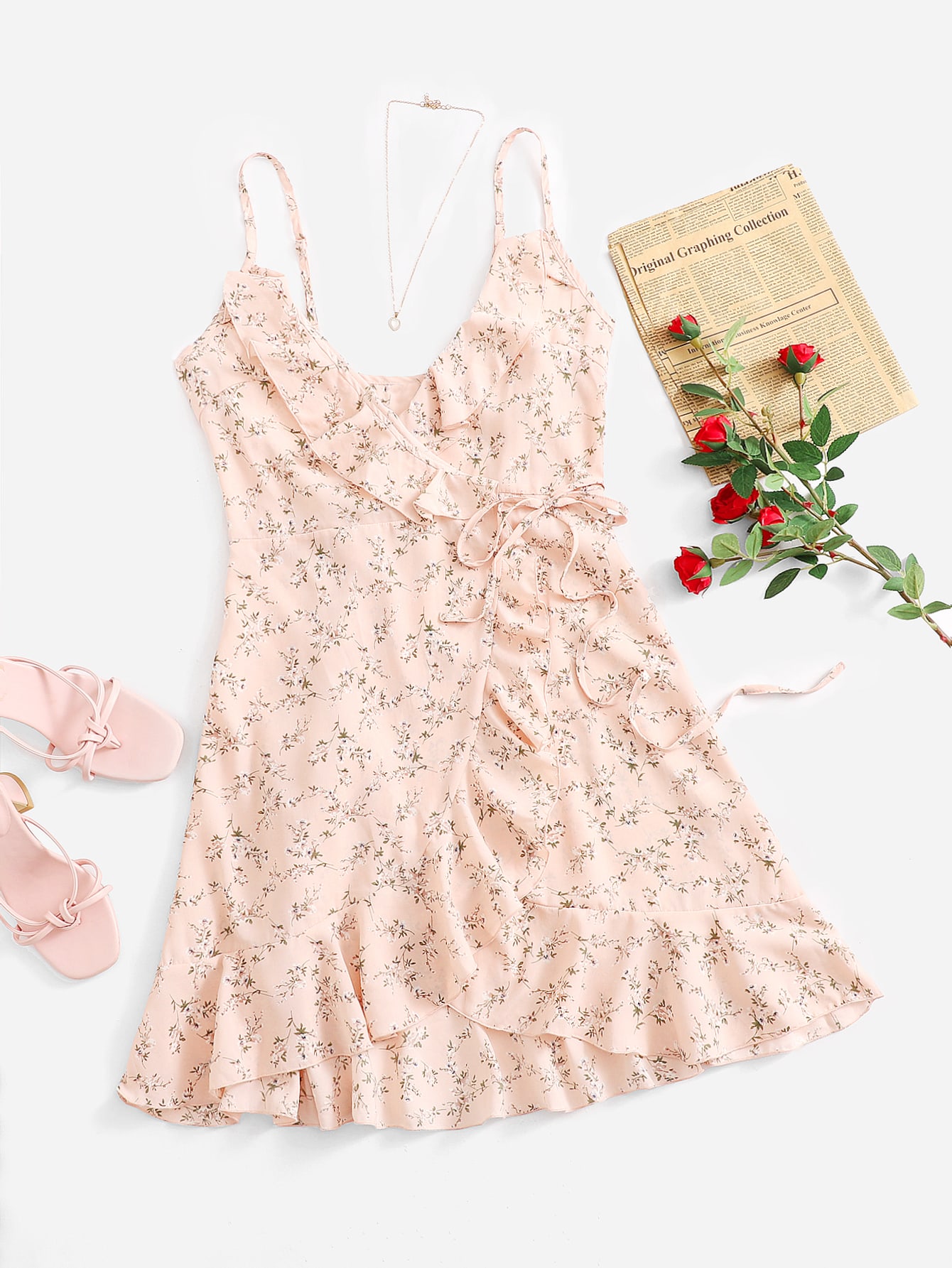 فستان منزلق بعقدة مطوي مقلم بكشكش بزهر اقحوان