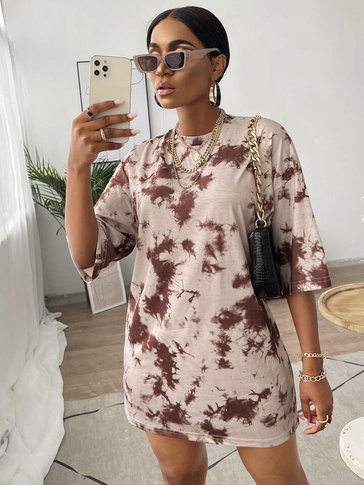 فستان تي شيرت بصبغ متعادل ومنخفض الكتف