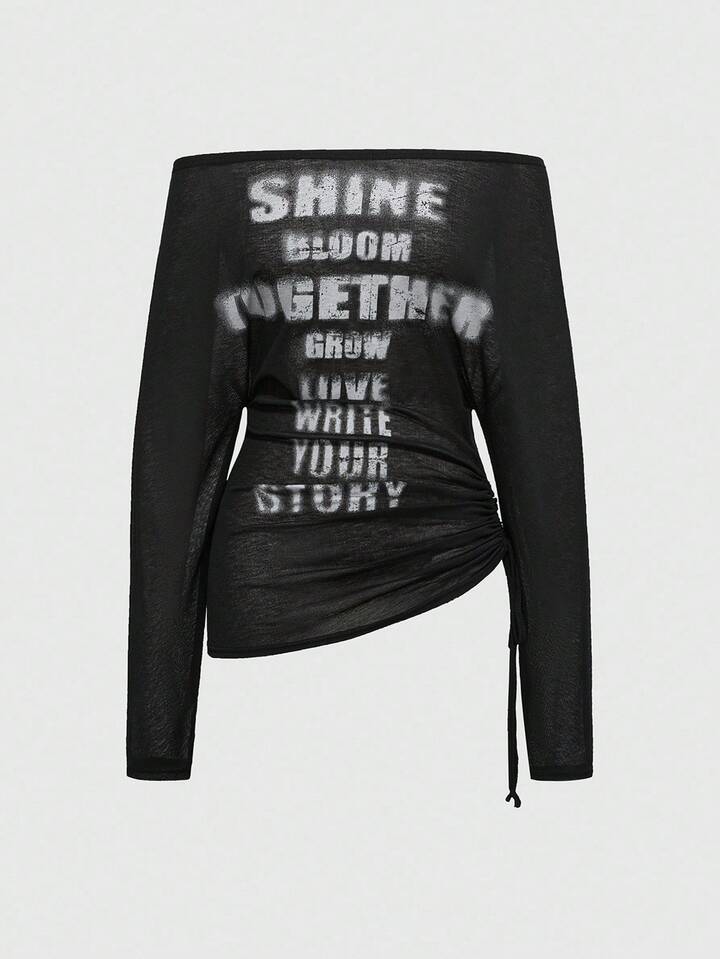 EDITION تي شيرت كتف مكشوف بطباعة صليب وحرف للنساء، بطراز رومانسي بانك
