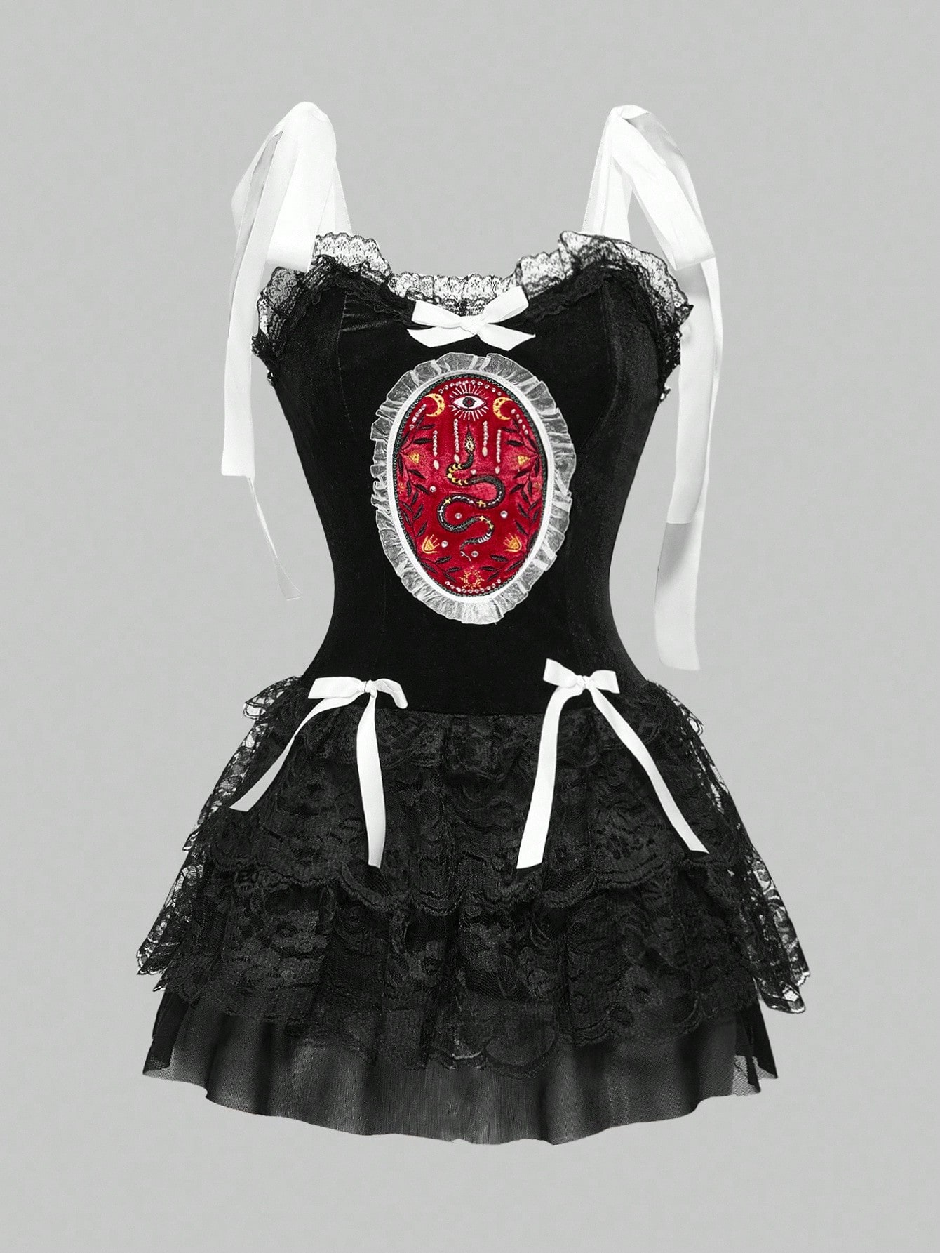 EDITION فستان نسائي مزين بالتطريز بتصميم الثعبان والورقة والعين بألوان متباينة مع تطريز الدانتيل والشريط المتقاطع والفيونكة، بنمط فيلفت مناسب لموسم الخريف والشتاء