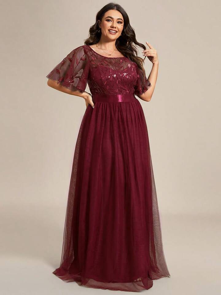 EVERPRETTY فستان رسمي أنيق مع جسم مرصع بالترتر والشبك، فستان وصيفة العروس باللون البرغندي لحفلات الزفاف في فصلي الخريف والشتاء