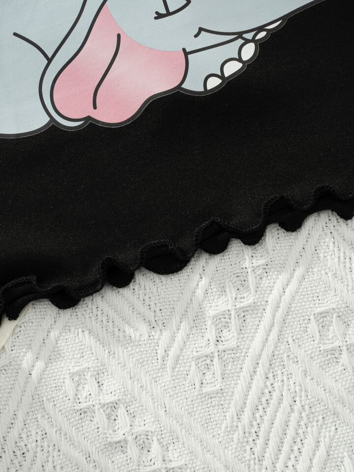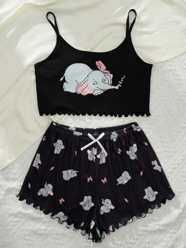 طقم بيجامة كامي مزين بطبعة الفيل والفراشة مع تريم من الخس