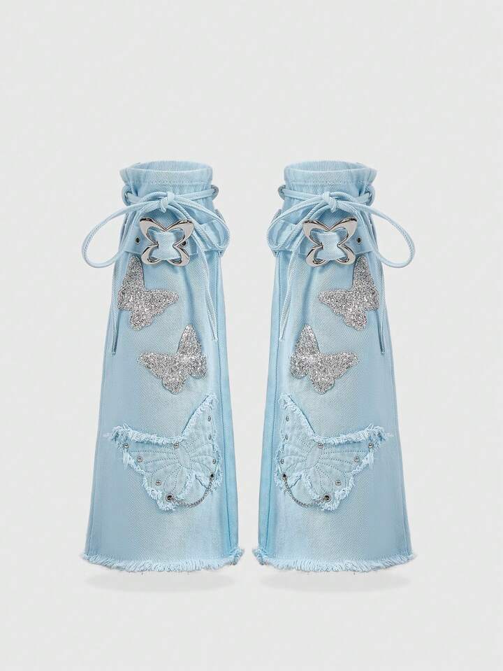 Fairycore زوج واحد من سروال بنطلون ستايل Y2K بطراز القطن القديم بشكل الفتاة المراهقة مع ربطة عنق، تراهيم بأسفل الساق العريضة و الخطوط المموجة بشكل عتيق، رائجة و تخفي الوزن الزائد مع حزام مزين بالفراشات الزينة