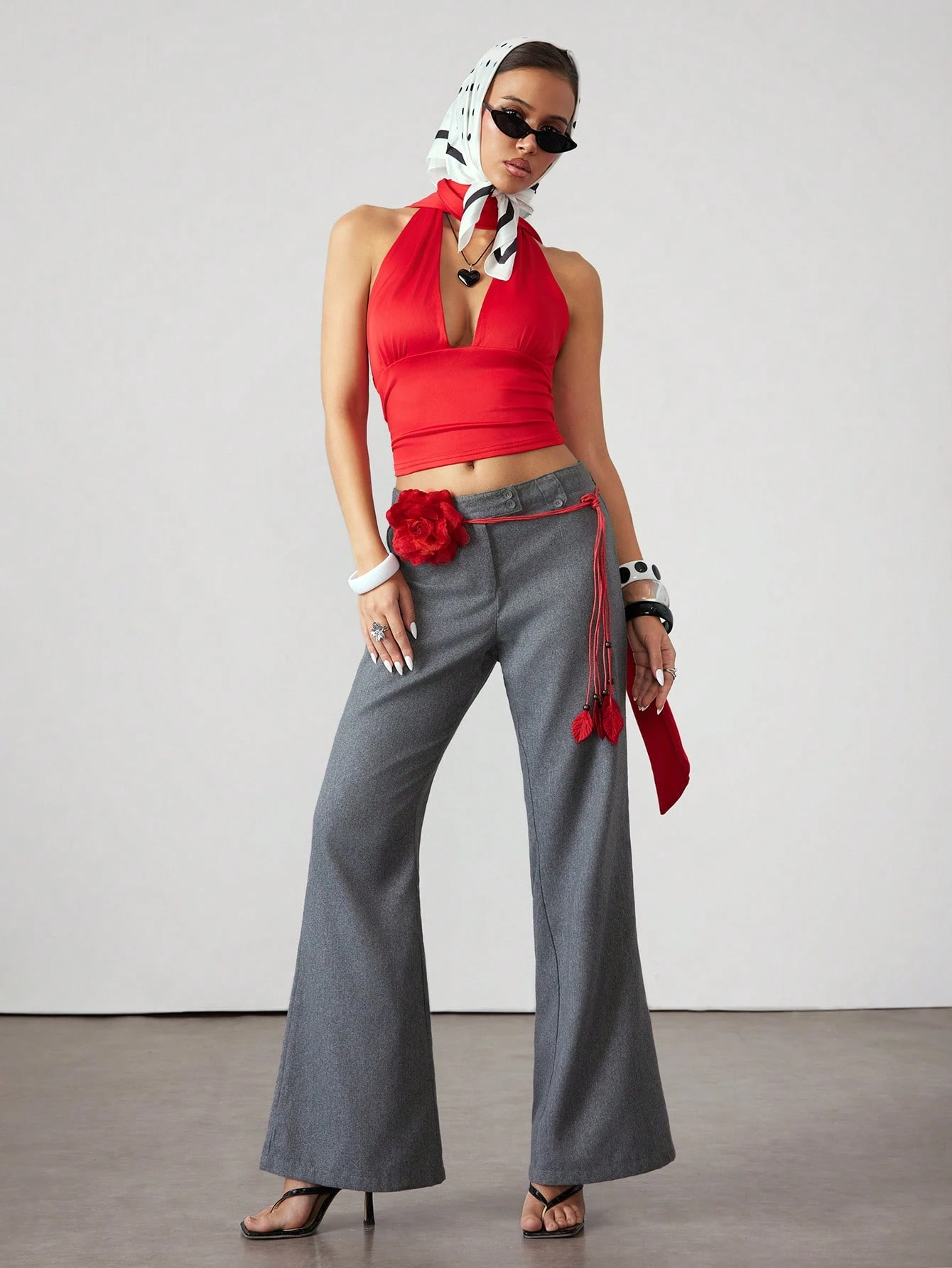 Fairycore قطعة واحدة أحمر ساحر مطبوع بزهور وأوراق ربط حزام, تصميم نباتي عتيق Y2K بدون إبزيم، أشرطة الزينة وحزام الخصر العصري
