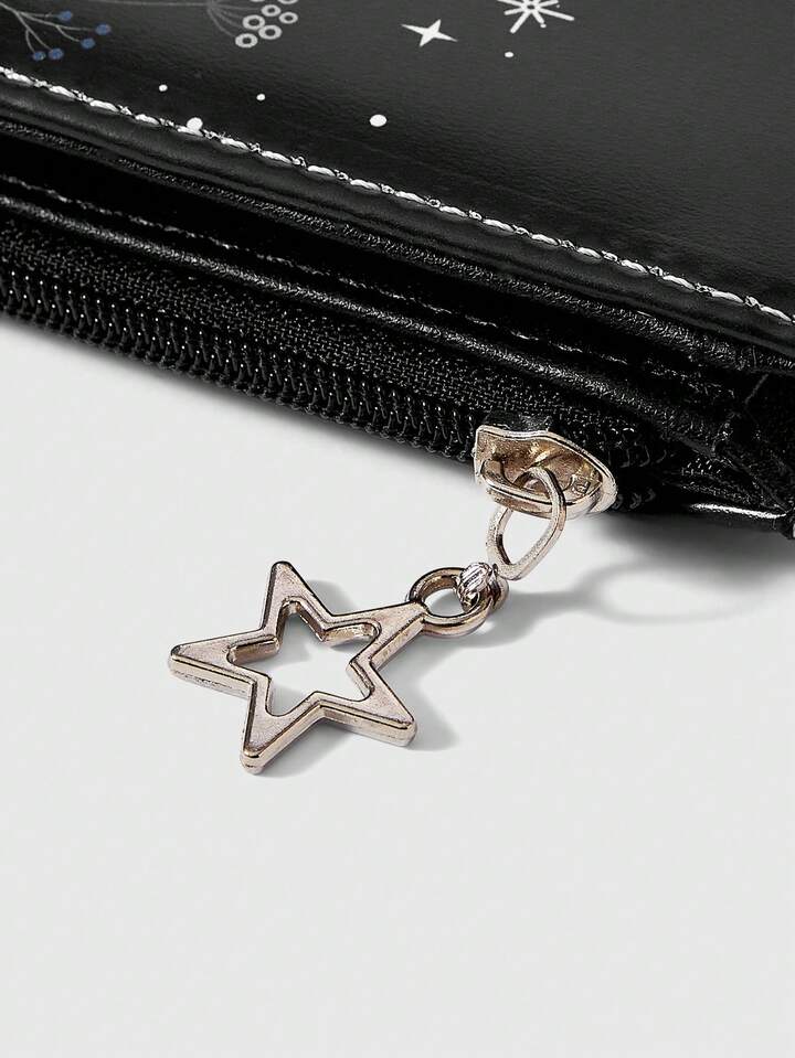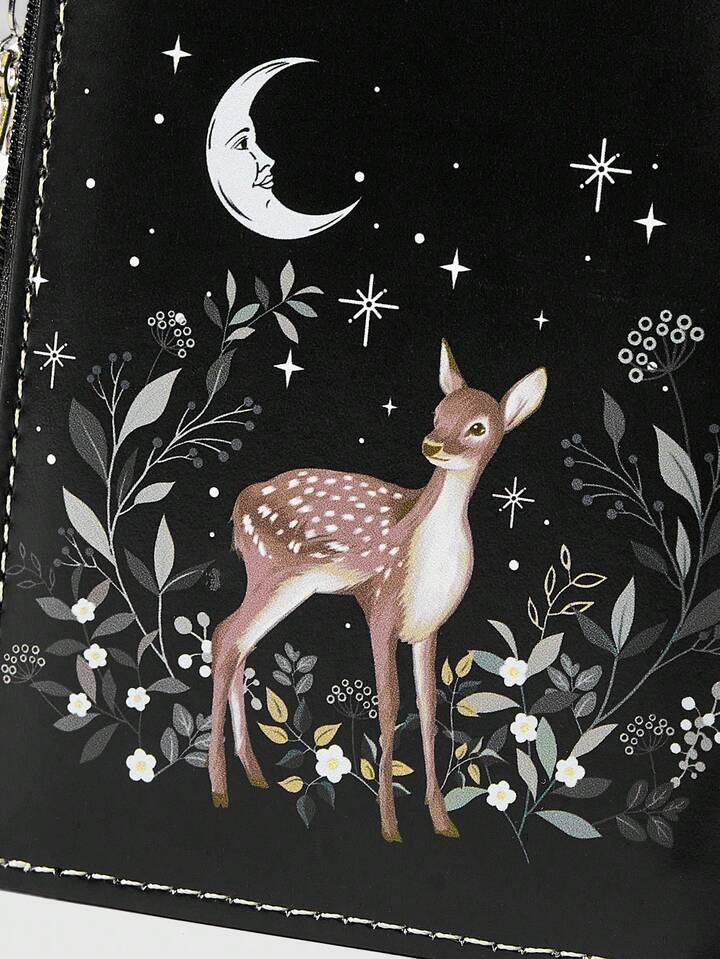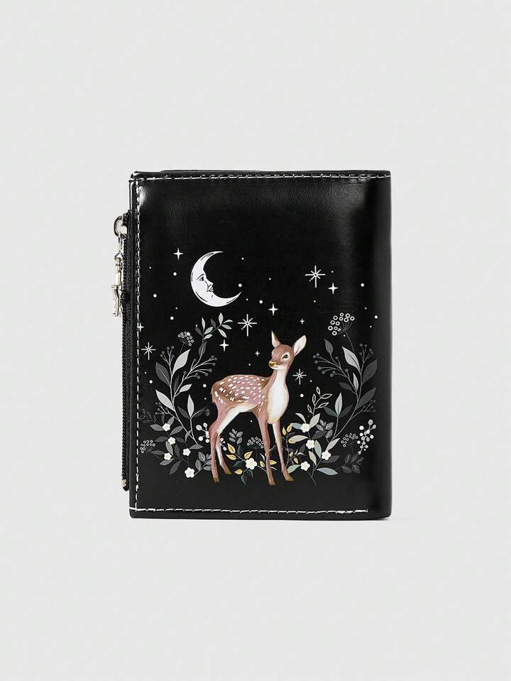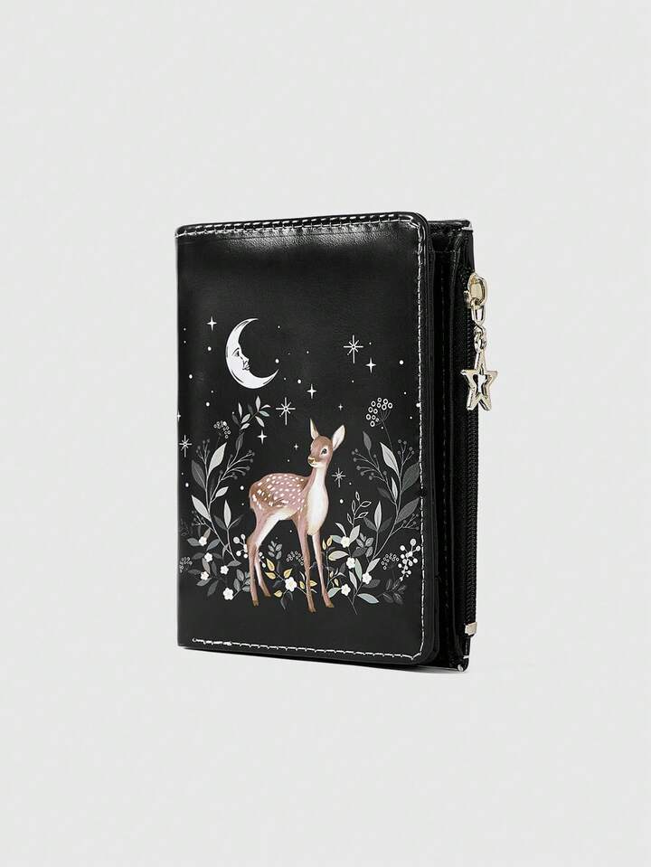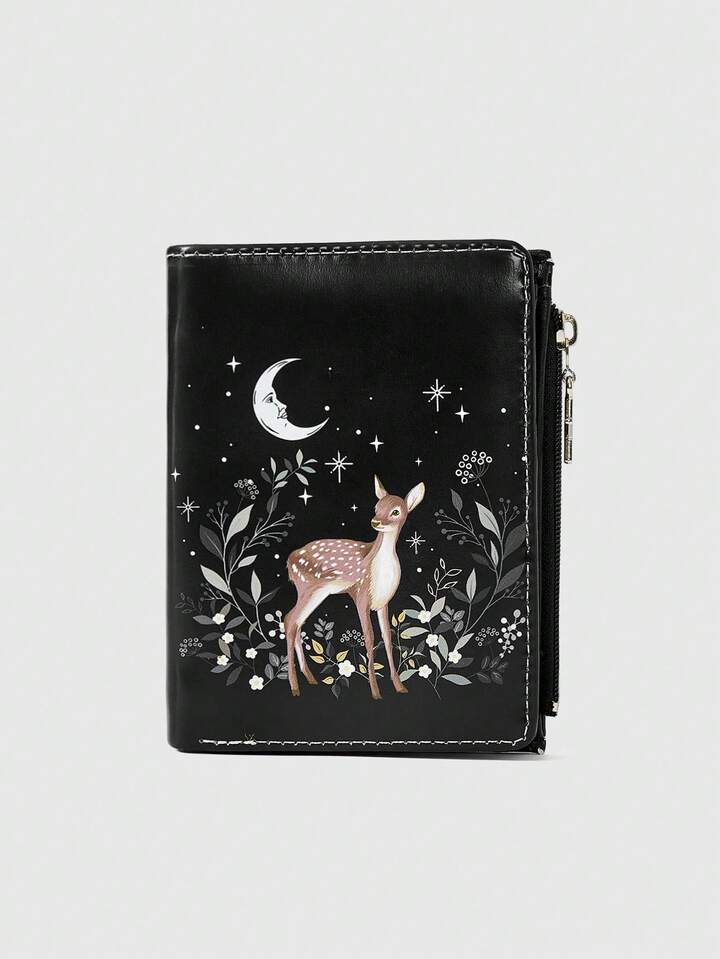 Fairycore 1 محفظة سوداء مطبوعة بتصميم إبداعي للغزال والقمر والنجوم والثلج والزهور، محفظة عملة عصرية متعددة الاستخدامات للجنسين، حامل بطاقات كاجوال أنيق