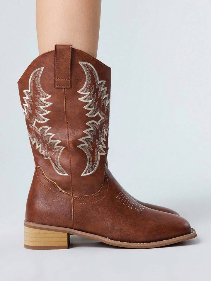 Fairycore بوت ركوب بني فاتح بكعب سميك مقطع على شكل V، بوت كاحل متوسطة مطرزة بطراز غربي، موضة جديدة لعام 2025 مناسبة للربيع والصيف والخريف والشتاء