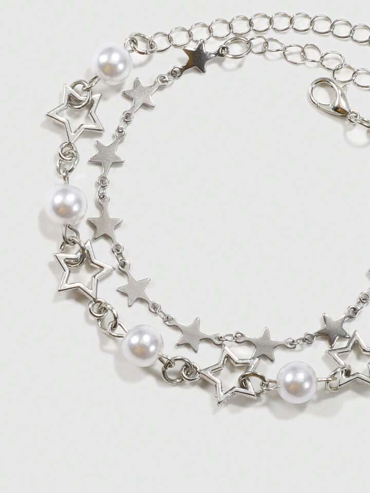 Fairycore سوار نسائي مزين بنجمة ولؤلؤة اصطناعية من سبيكة النحاس الأنيقة 2قطع/طقم للزينة اليومية