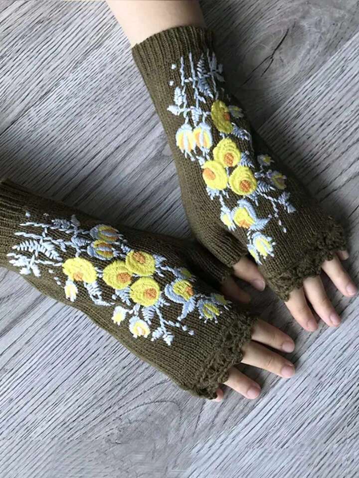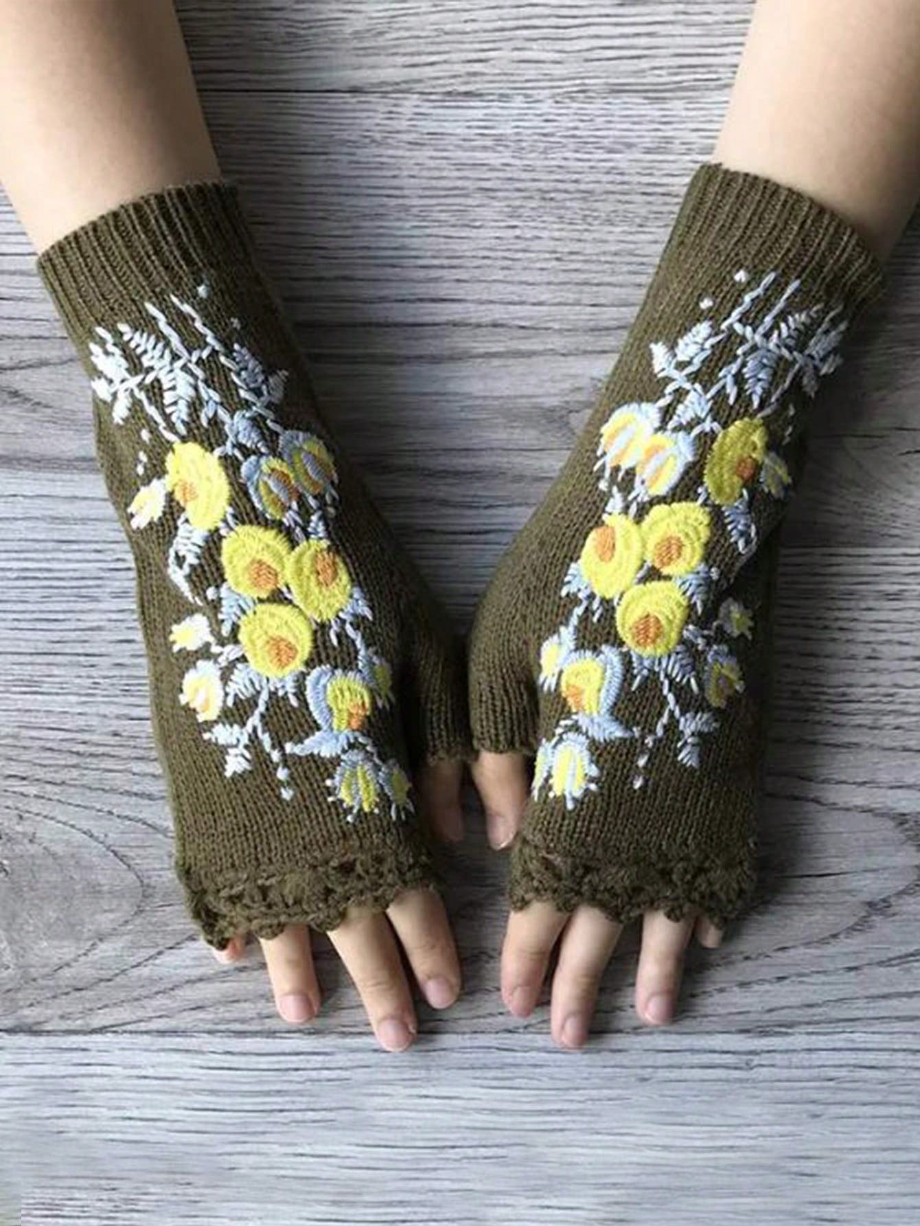 Fairycore بوهيميا الكروشيه اليد قفازات مع مطرز أصفر زهور , الشتاء دافئ نصف اصبع قفازات للنساء
