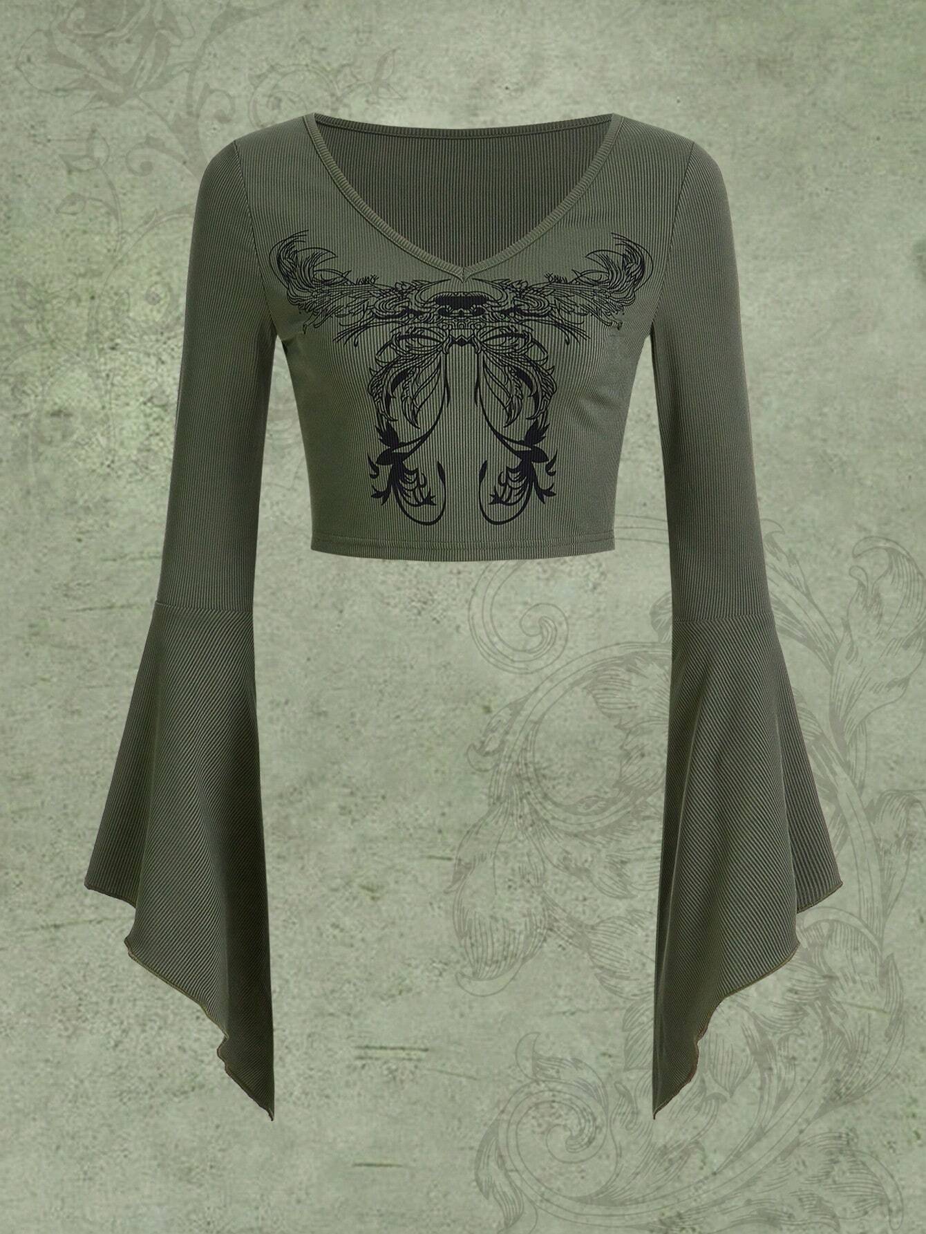 Fairycore تي شيرت قصير بطباعة الفراشة اكمام واسعة مضلع