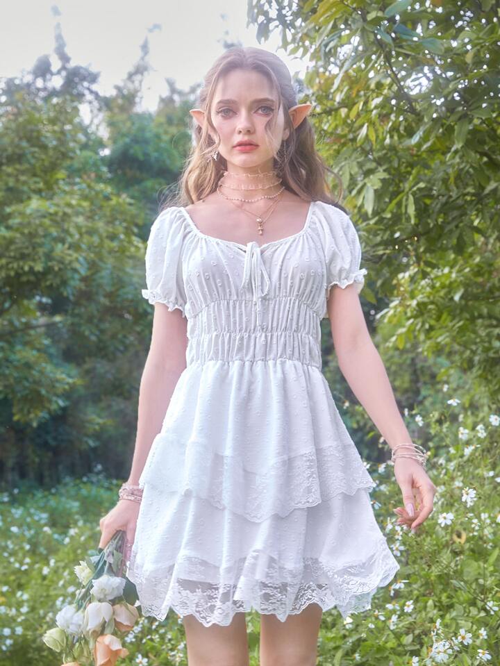 Fairycore فستان دانتيل متباين اللون طية صدر اكمام منتفخة