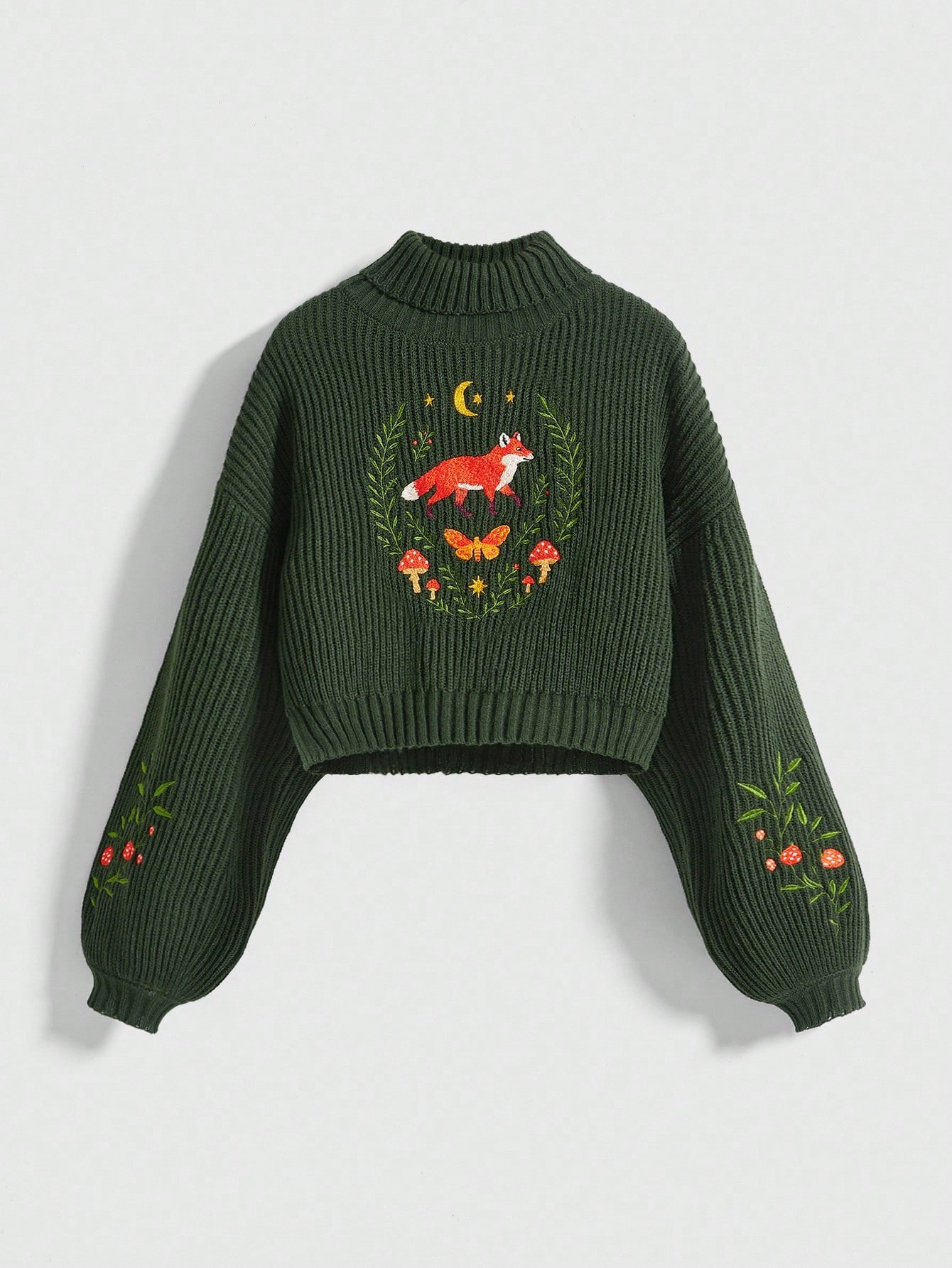 Fairycore كنزة صوفية كنزة نصف رقبة عالية مطرزة بأشكال الفراشة والفطر والنبات والقمر والنجوم والثعلب بأسلوب فايري موري