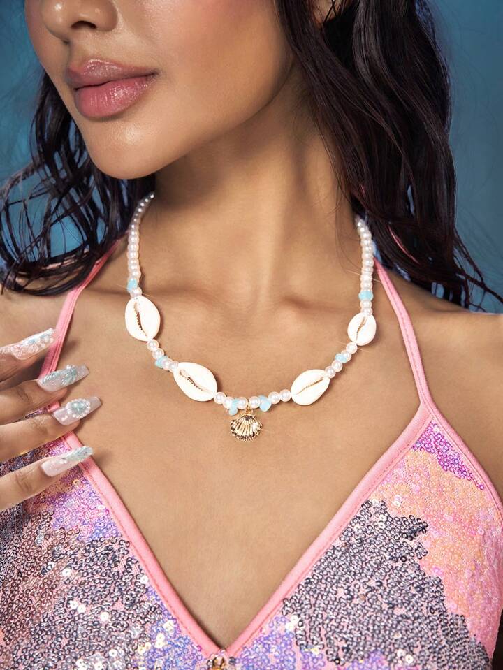 Fairycore قلادة موضة بتعليقة من الصدف والبلورات الزرقاء