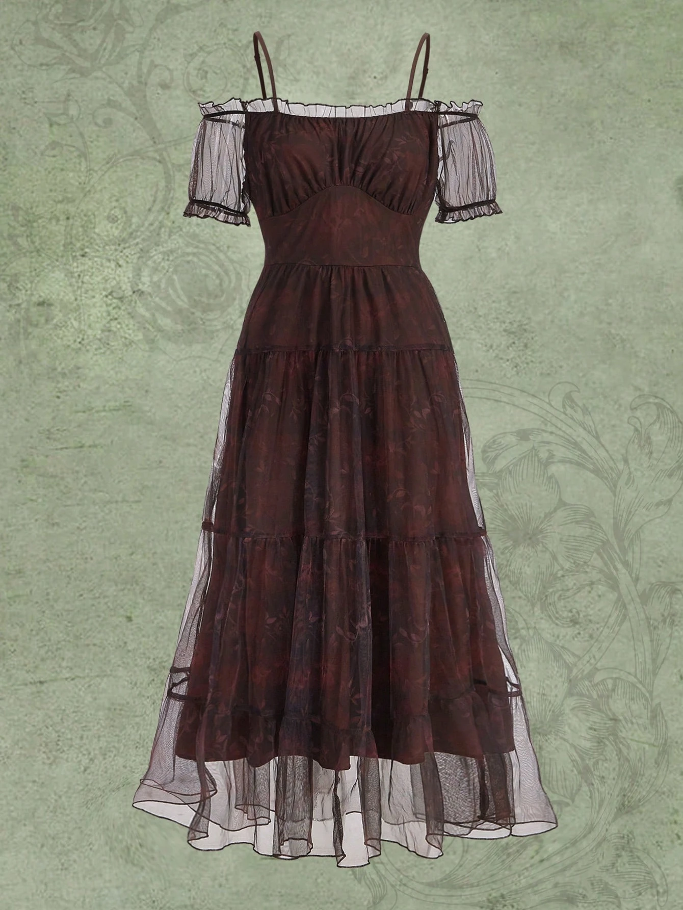 Fairycore فستان طباعة الأزهار شبكة متباينة كتف مكشوف حافة مكشكشة
